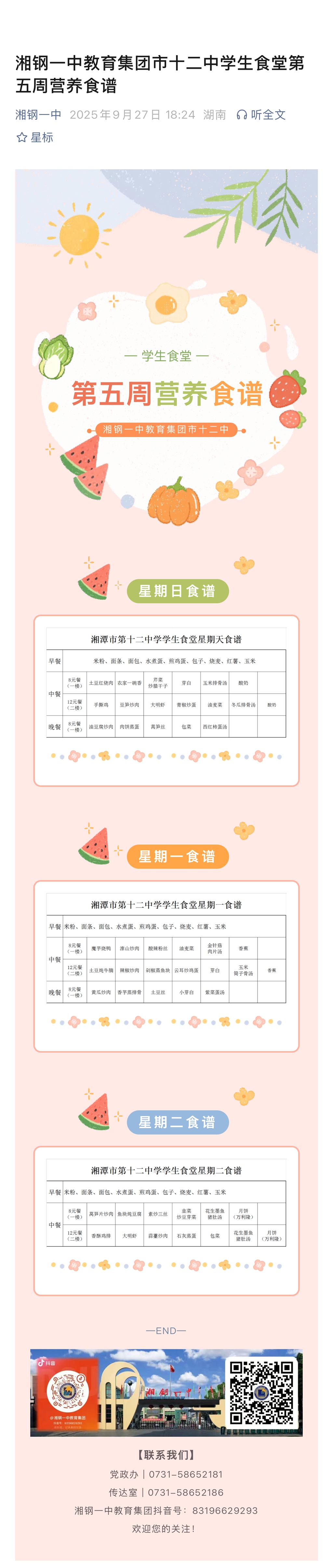 湘钢一中教育集团市十二中学生食堂第五周营养食谱