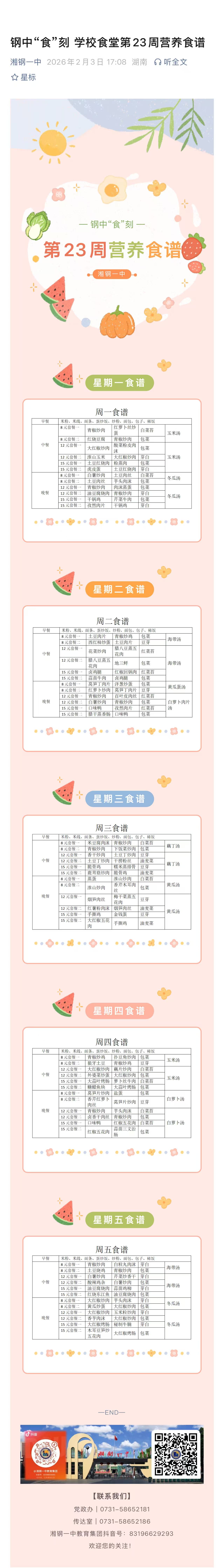 钢中“食”刻 学校食堂第23周营养食谱
