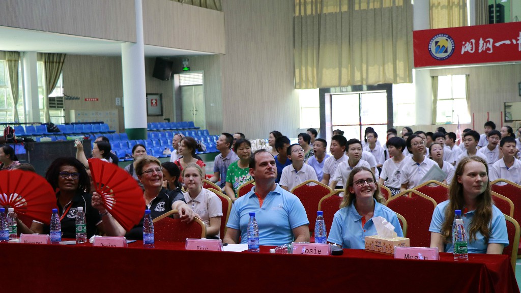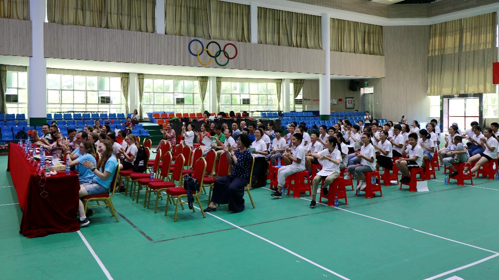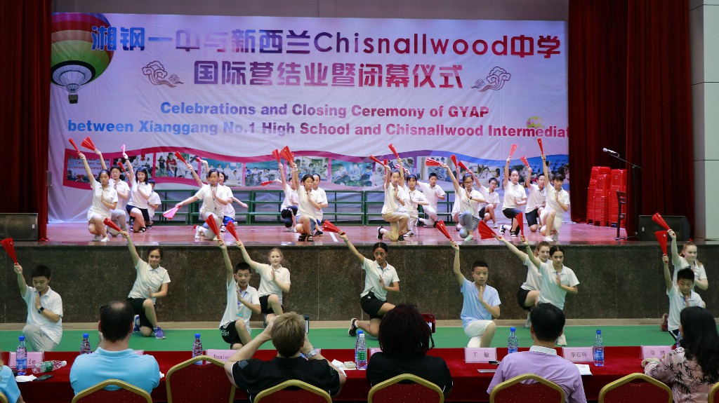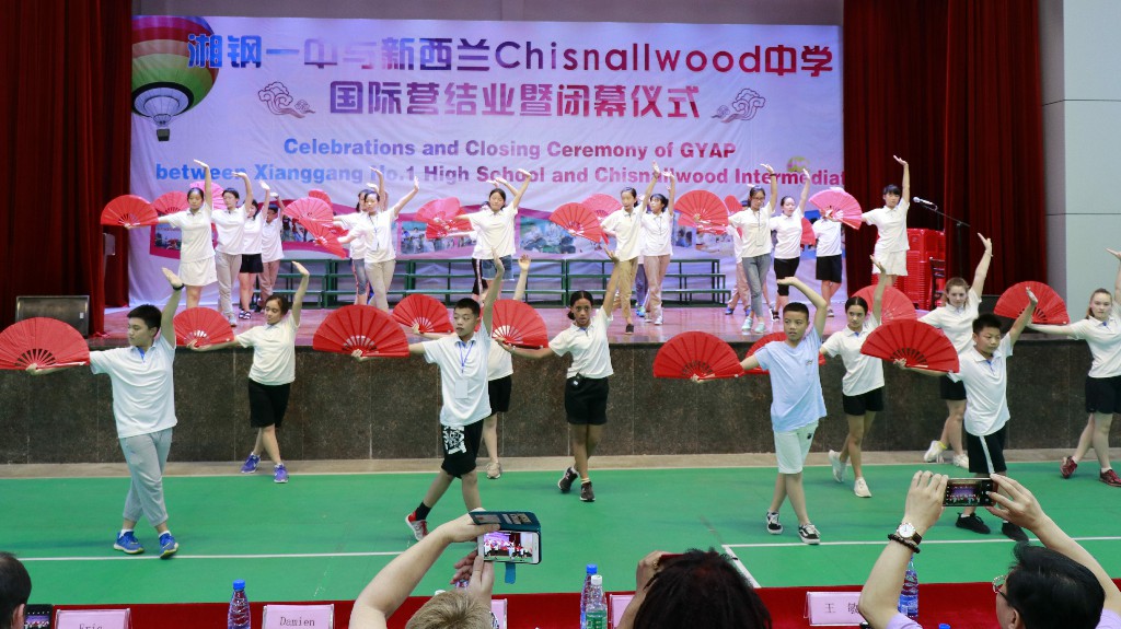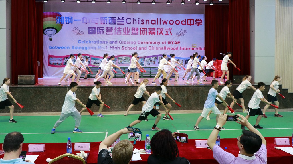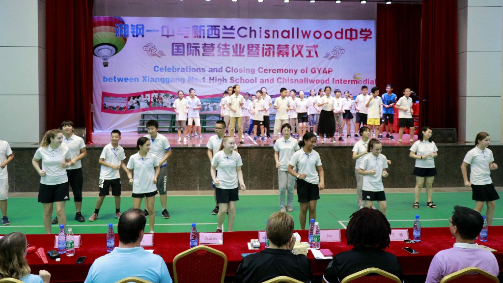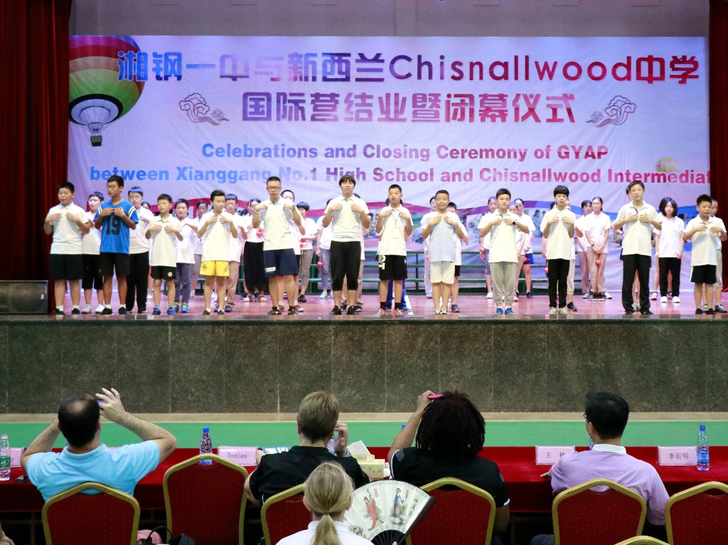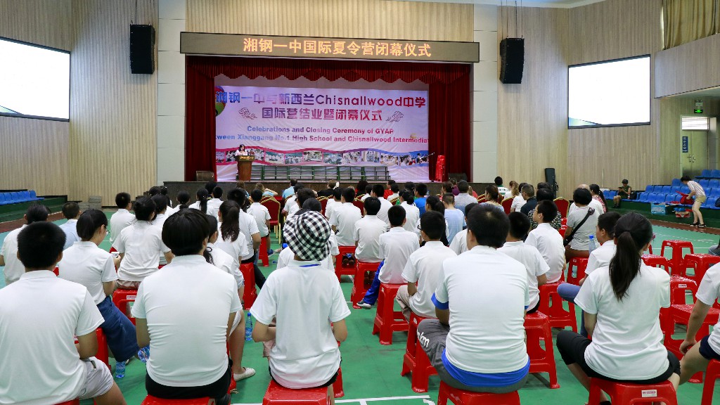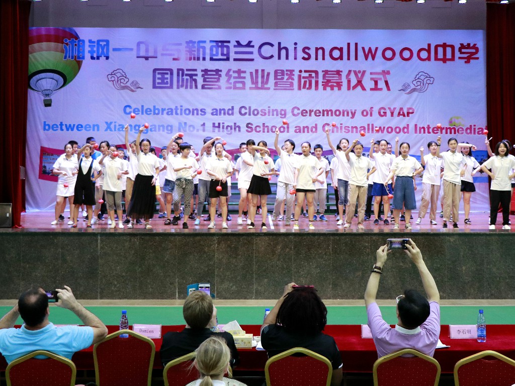 7月21日上午,湘钢一中与新西兰Chisnallwood 中学国际营结仪式暨闭幕式在湘钢一中体育馆举行,闭幕式在全体营员欢快的Cha Cha舞中拉开序幕,孩子们载歌载舞,欢庆结业。