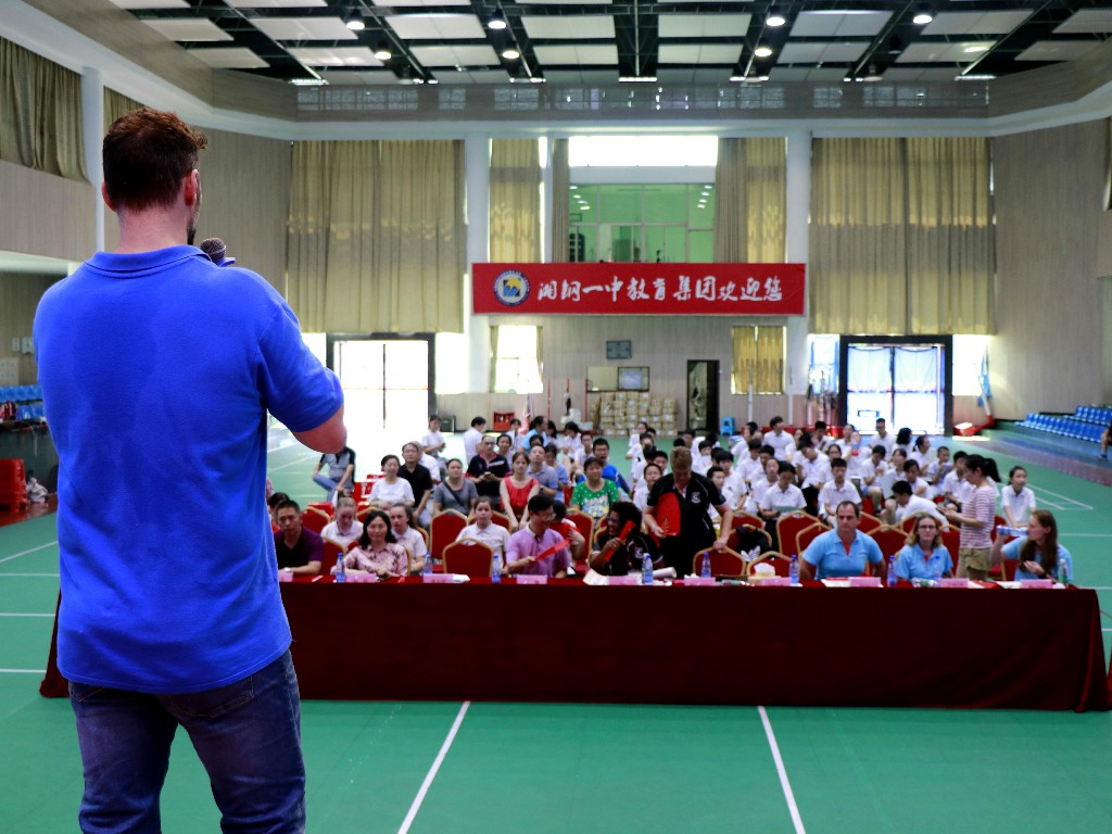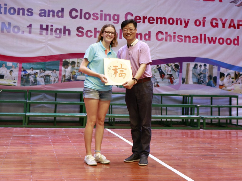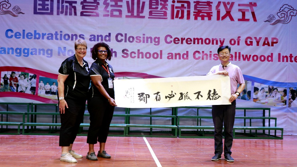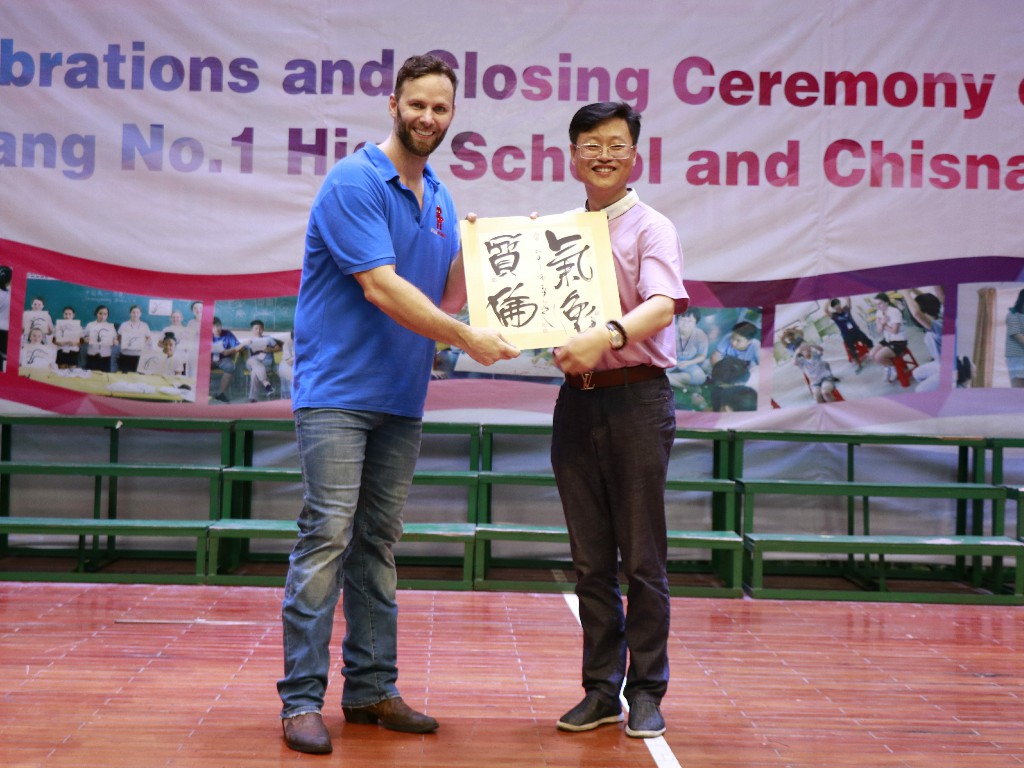 闭幕式上,周炜书记代表承办方向全体外教、营员、工作团队、学校领导团队和湖南省国际交流协会表达了真诚的感谢。湘钢一中教育集团校长王敏分别赠送给外教Iva、Margaret、Damien、Eric一幅亲手书写的书法作品,并赠送给新西兰Chisnallwood 中学一幅书法作品:“德不孤,必有邻。”