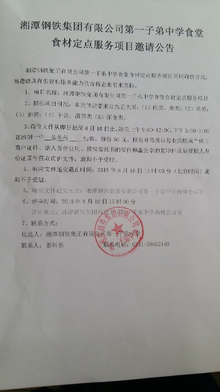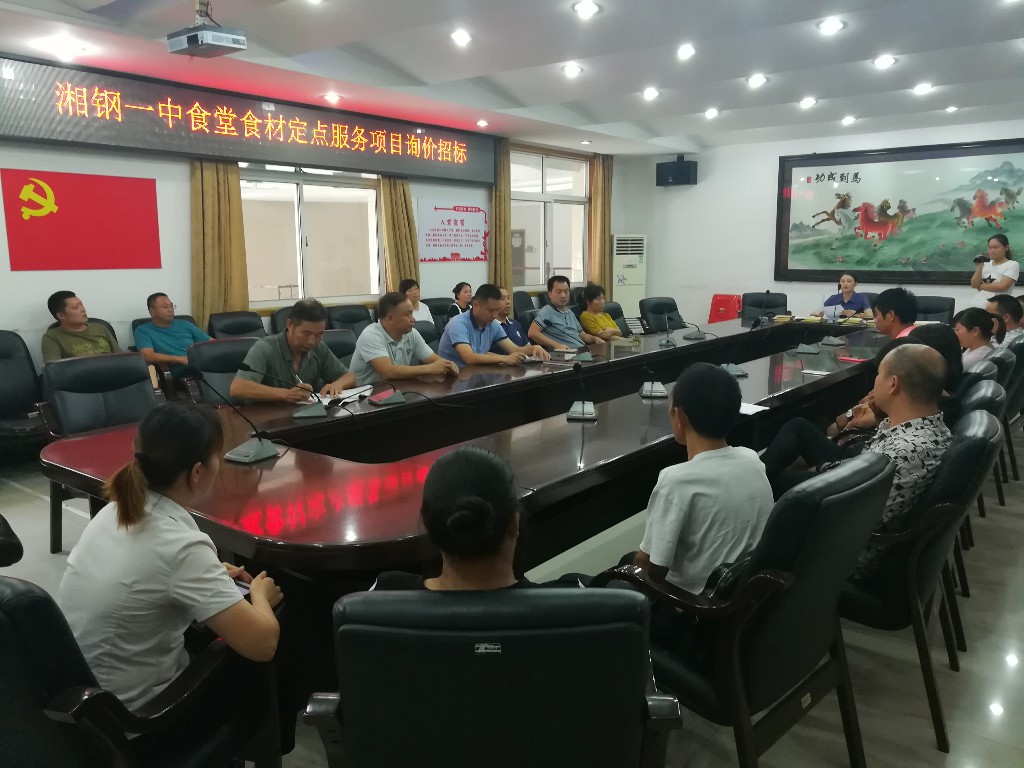 2018年8月16日,湘钢一中在南楼会议室进行了食堂食材定点服务项目询价招标,学校后勤校长、工会主席、纪委书记、膳食委员会主任及部分教师代表、食堂采购员及工作人员代表参加了招标。