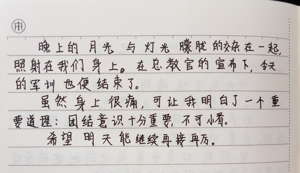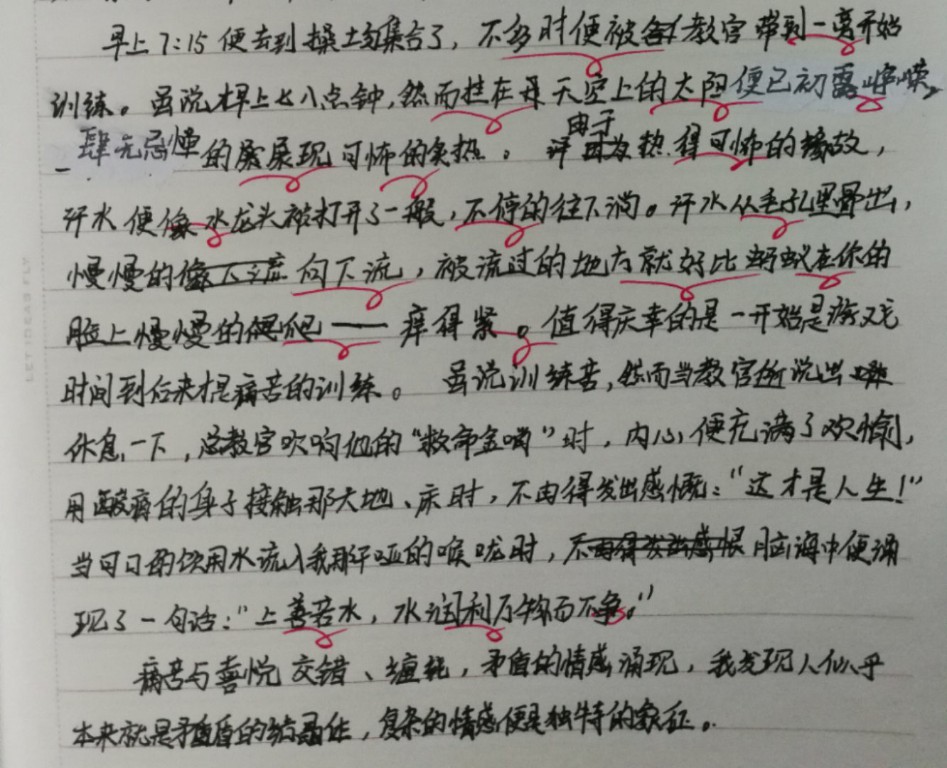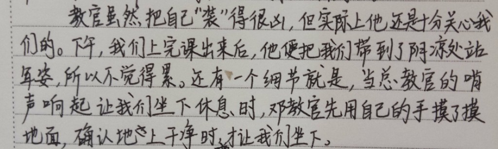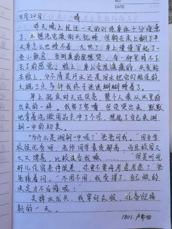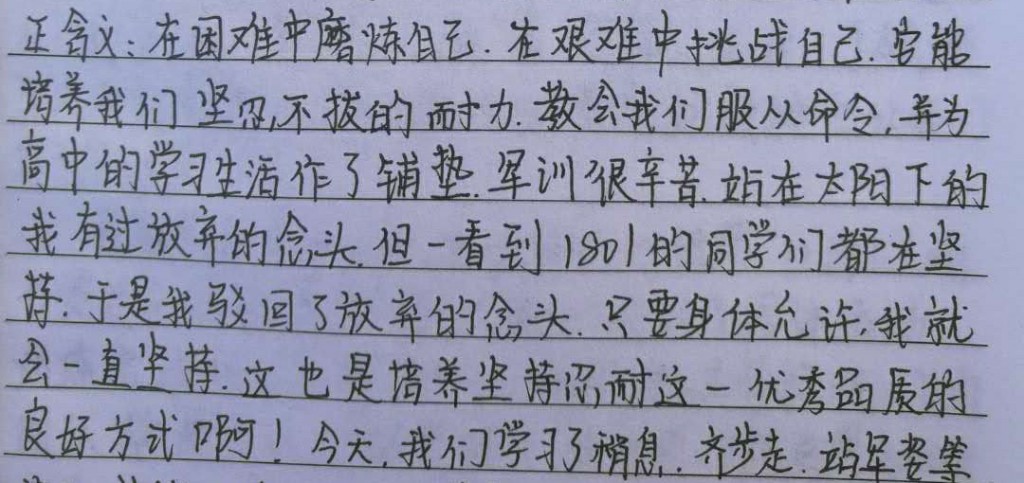 下午,阳光更加热情,像个火球似的炙烤着大地,它晒红了同学们的脸,晒得大树不敢有丝毫摆动,晒得树上的知了也不吭声了。我们不断地重复着枯燥的动作,每个人都有些筋度力尽了。教官铿锵有力的声音不断在耳边回响,鼓励我们要磨练意志、战胜自己,豆大的汗珠从脸上滚落,我们的内心变得更加坚殿,比以前更加顽强了。我就是打不死的小强,因为我独一无二。“我是天下第一”,数官说,我们要为自己骄做内心的坚殿为高中铺路,汗水不断沃灌梦想,直至开出最美的花朵!