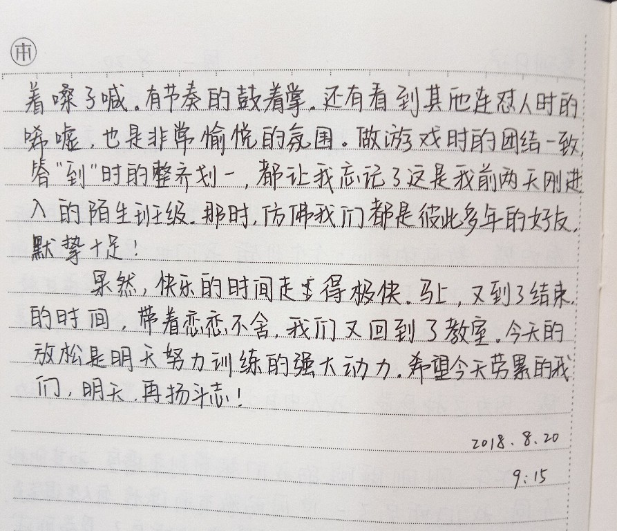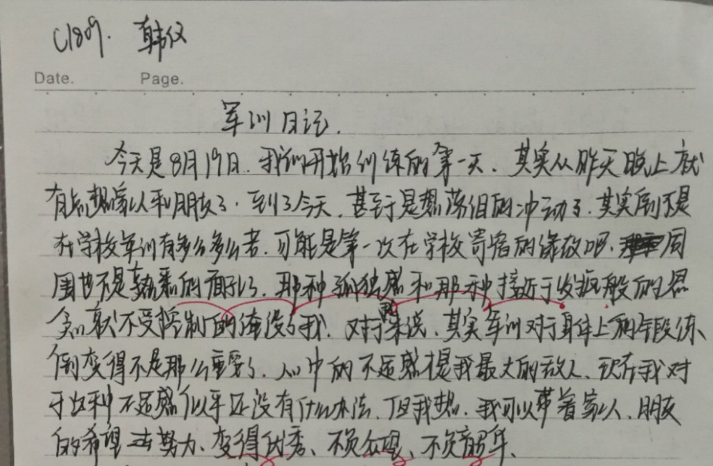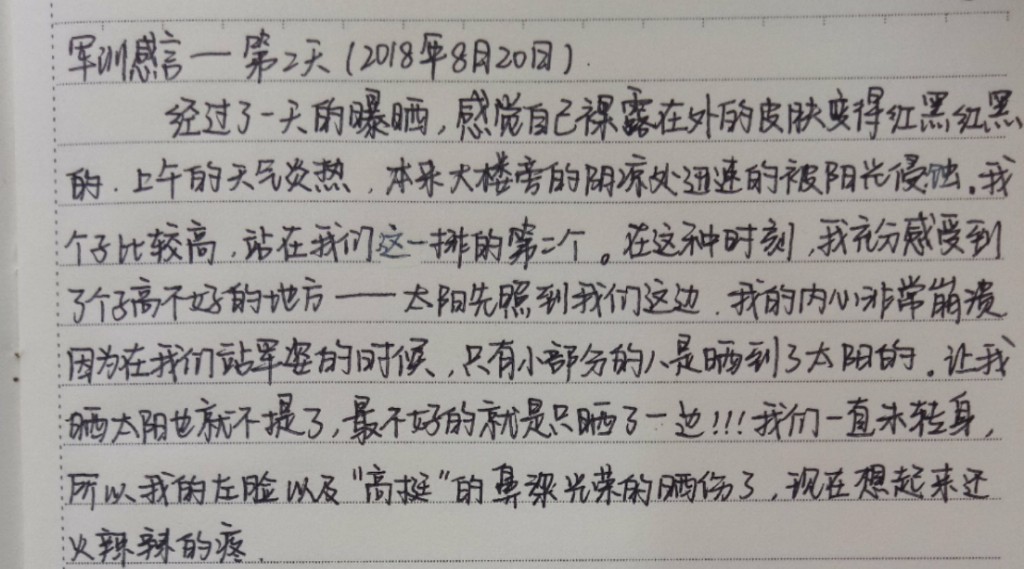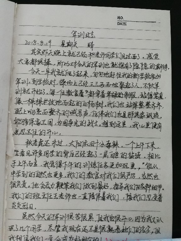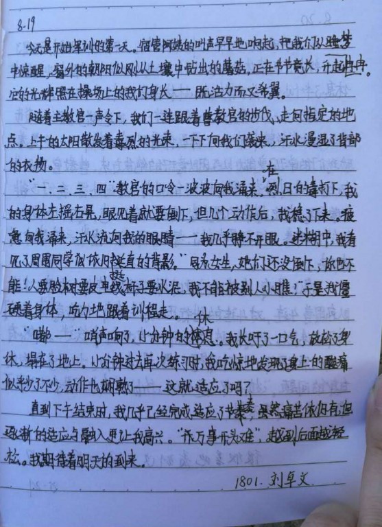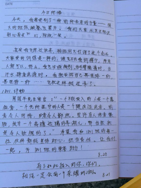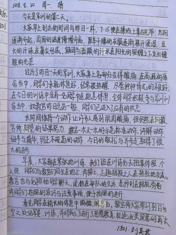 其实笑声朗朗的孩子们,已经被烈日扎实地炙烤了两天。可能是为了磨炼18届孩子们,今年军训的阳来得异常猛烈。室外温度38度,而操场温度更甚。空调、冰激凌、西瓜、电脑、手机,这些暑假标配已然成为了军训“绝配”;“葛优躺”已然成为了“白杨站”;肤如凝脂已然成为了包公黑,呕吐,肚子疼,头晕,各种状況接连而来,孩子们休息片刻,挺拔的身姿又出现在队伍中。紧咬的牙关,盐渍地图的校服,如珠的暴汗,日志字里行间对教官的真情。种种皆是少年骨子里的韧劲在坚持,皆是少年心间的军人情结在涌动。男儿何不带吴钩,收取关山五十州,国有召,召必回……那一身绿,筑起的就是中国的脊梁。