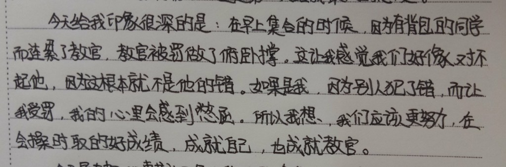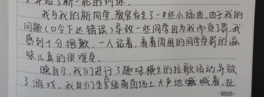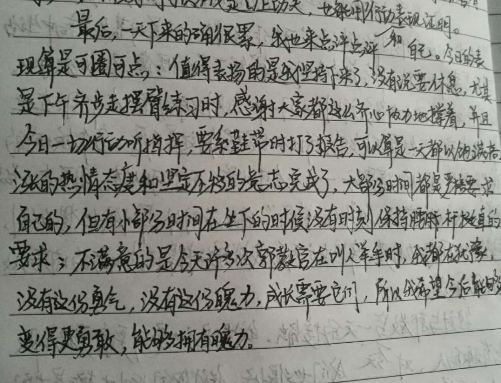 流血流泪不流汗,掉皮掉肉不掉队!这就是军人的意志,也是我在第一天军训中所体会的,每一位教官都是铁骨铮铮的汉子,有着坚毅的脸庞和出众的气质。站如松,坐如钟,他们用行动告诉了我们什么是军人。他们如得道高僧,来教我们这些顽皮的小僧。