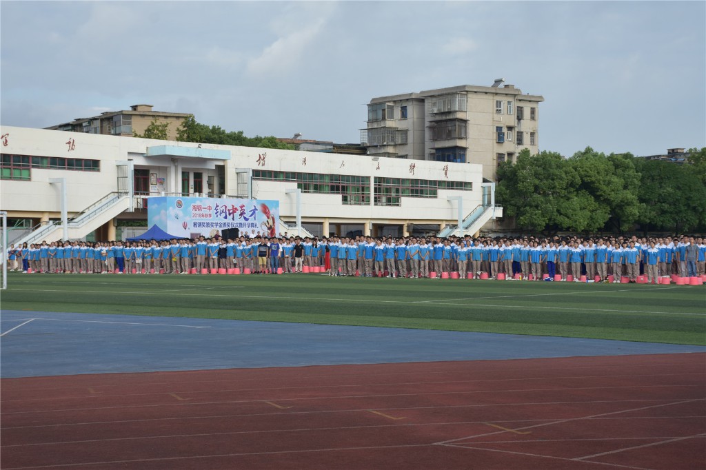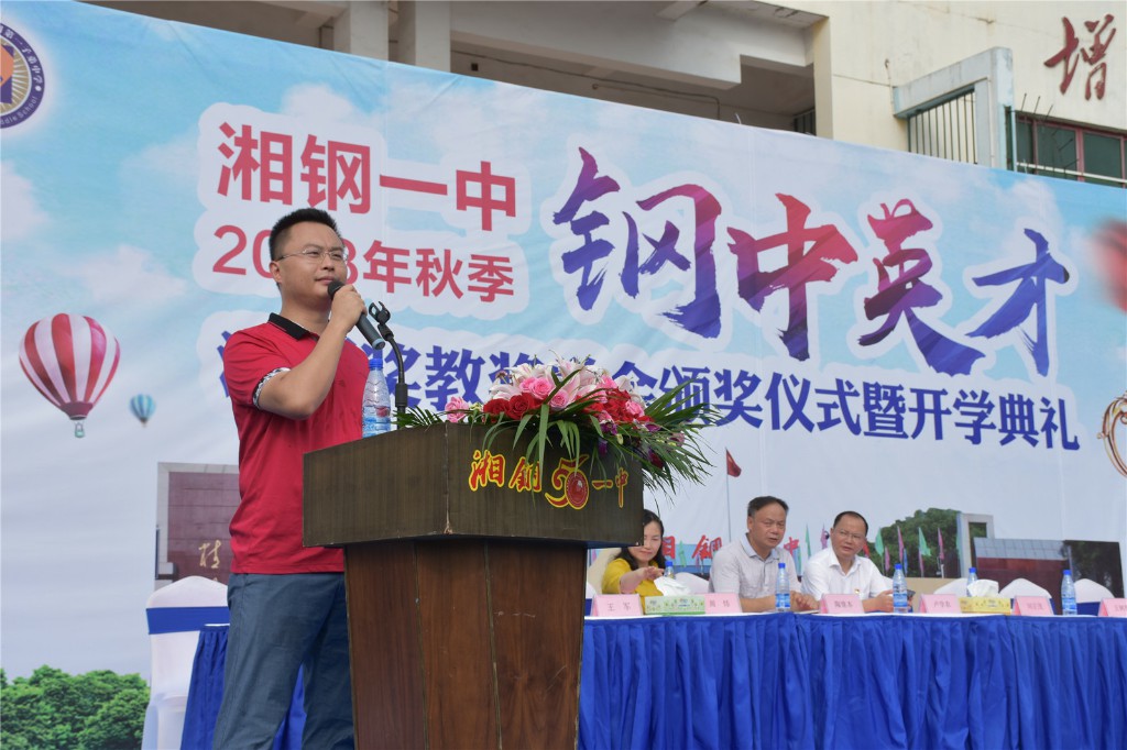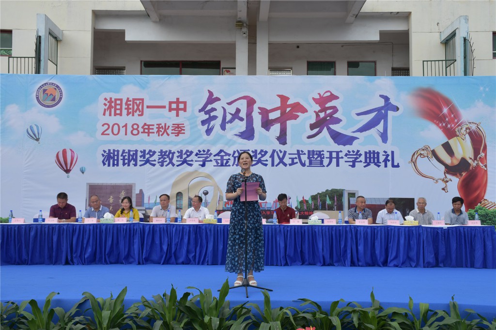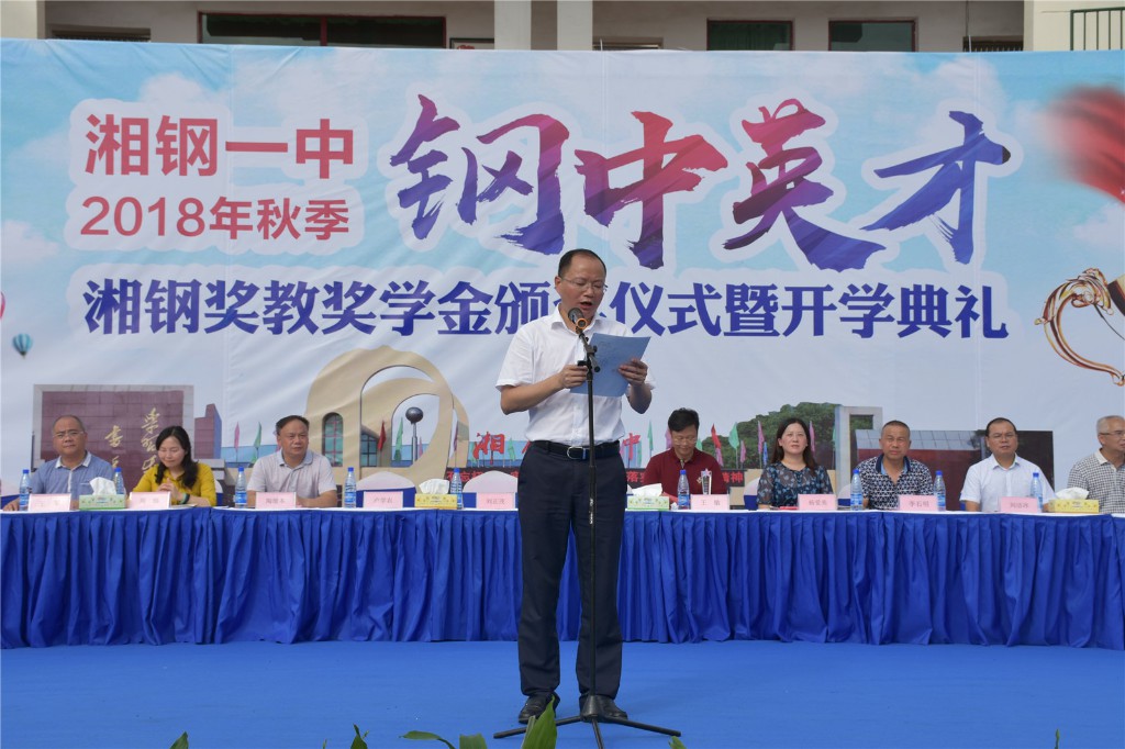 2018年9月1日,在天高云淡的金秋时节,湘钢一中教育集团本部校区全体师生齐聚在体育场,举行2018年秋季开学典礼暨首届“钢中英才”湘钢奖教奖学金颁奖仪式。湘钢集团公司党委书记王树春、湘钢集团公司副总经理、湘钢一中校级家委会主任刘正茂、家委会代表杨爱美及湘钢一中教育集团全体校领导出席了典礼,典礼由湘钢一中校长助理王锦兵主持。