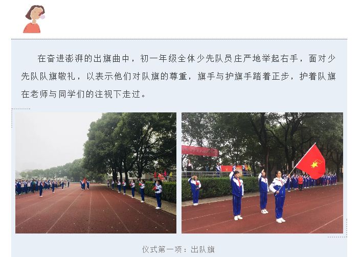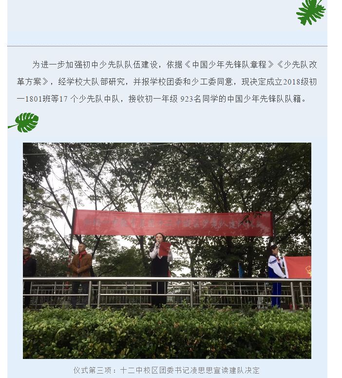 “少年智则国智,少年富则国富,少年强则国强,少年独立则国独立,少年自由则国自由,少年进步则国进步。”梁启超先生在百年前曾写下这一段铿锵有力的话语,至今仍鼓励着无数中国少年。日新月异,做好少年儿童的思想引领工作仍是重要方针,为了深入贯彻落实《少先队改革方案》,紧紧围绕立德树人的根本任务,推动少先队工作改革创新,提高少先队员的思想性、先进性、自主性、实践性,增强少先队员的集体荣誉感与组织归属感,更好地服务我校少年学子快乐生活,全面发展,健康成长,十二中校团委、少工委在2018年10月22日举办了 “争当新时代好队员,集结在星星火炬旗帜下”的主题队日活动暨湘钢一中教育集团十二中校区2018学年初一年级少先队建队仪式。