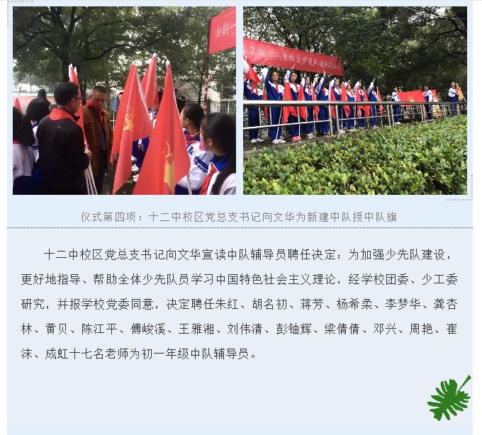 湘钢一中教育集团十二中校区党总支书记向文华、工会主席谭小刚、学生部部长王兴波、学生部副部长成斌、年级组长汪洋、郭渡、彭小焱、朱红出席了本次活动。仪式由十二中校区团委书记凌思思主持。