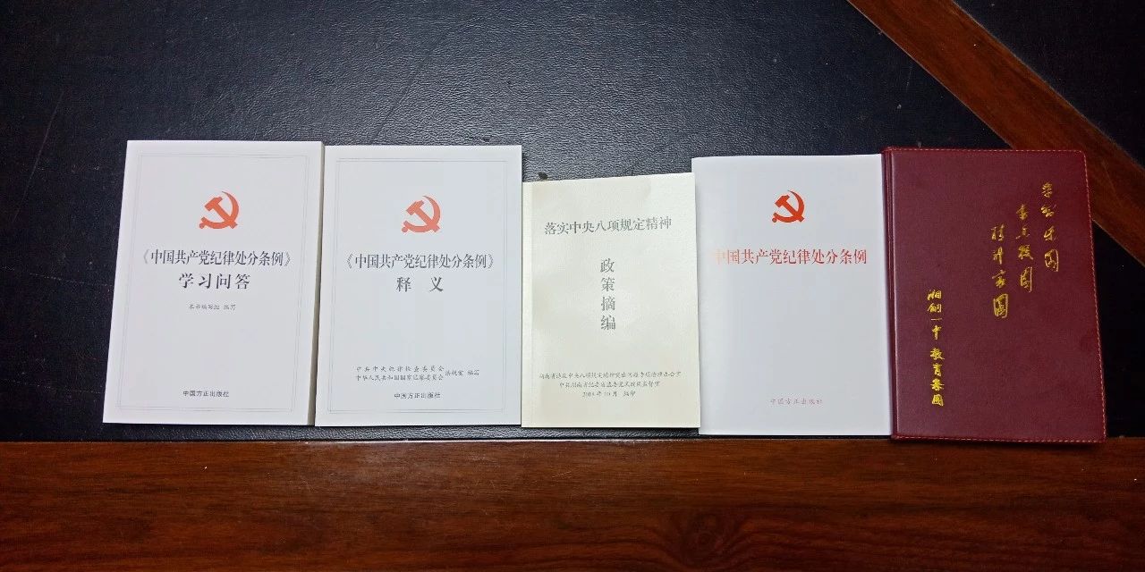 接着对《中国共产党纪律处分条例释义》、《中国共产党纪律处分条例学习问答》、《中国共产党纪律处分条例》、《落实中央八项规定精神政策摘编》、教育部印发《中小学教师违反职业道德行为处理办法(2018年修订)》、中共中央纪委印发《关于持之以恒正风肃纪确保2019年元旦春节风清气正的通知》等文件进行细读学习。