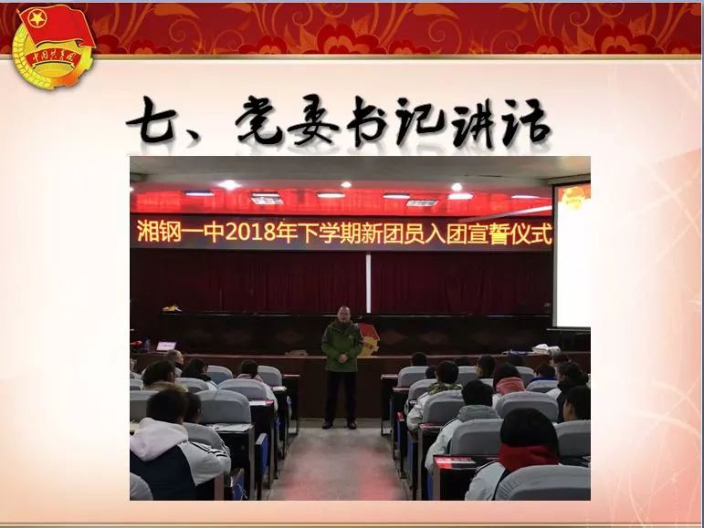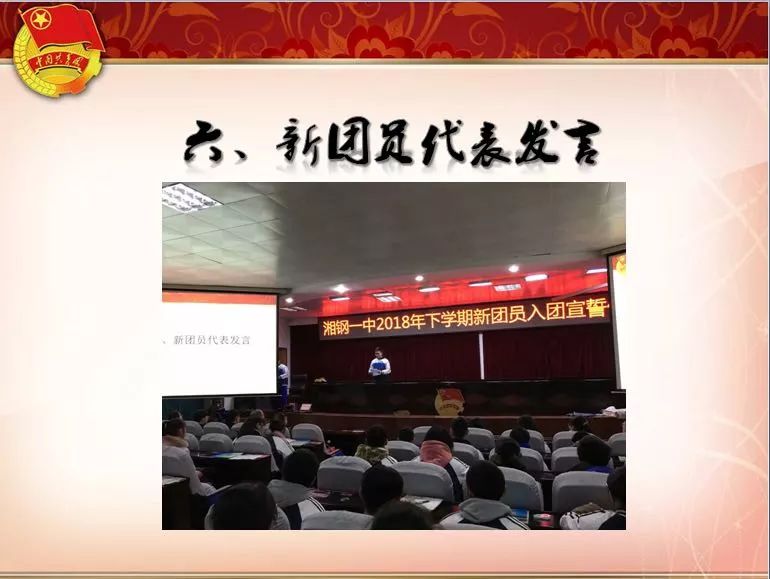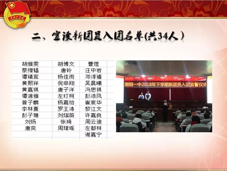 1月4日下午,我校2018年下学期新团员入团宣誓仪式在北楼大会议室隆重举行。湘钢一中教育集团党委书记卢学农、学生科科长张劲、团委书记周小滋出席仪式,受邀参加的还有来自高二年级的6位优秀老团员代表,他们均获得2018年市级优秀团干和优秀团员称号。本学期我校共有34位新团员入团,他们通过班主任择优推荐、系统的团校培训、严格的团考后脱颖而出,成为共青团的新生力量。入团宣誓仪式由校学生会主席刘欢、校团委会副书记成灵骏主持。