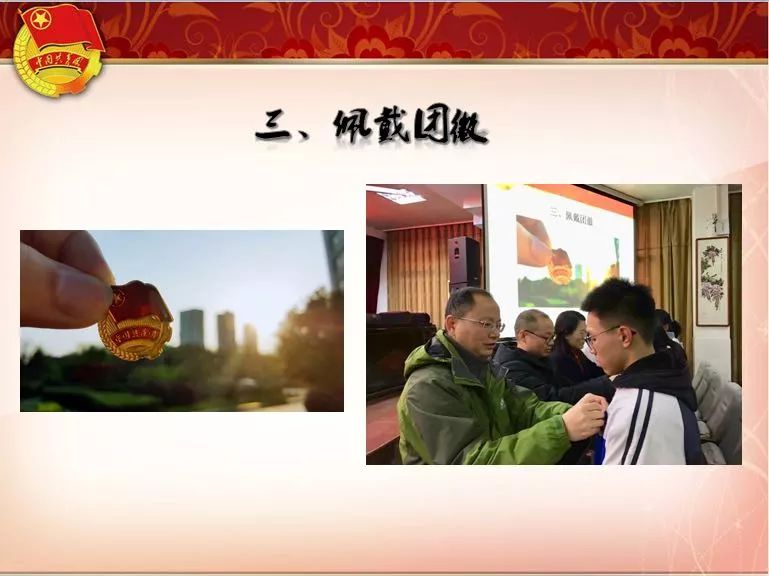 领导和优秀团员代表们为新团员佩戴团徽,闪闪的红色烫金团徽别在左胸前,代表的不仅仅是身为团员的荣耀,更是一份沉甸甸的责任。