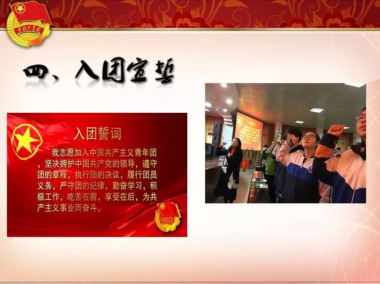 入团,是一种理想,他把我们的青春描绘得更加灿烂;入团,是一份责任,激浊扬善,用爱心鼓起希望的风帆;入团,是一种动力,无形的力量鞭策我们力争上游,奋发有为;入团是一份自豪,闪闪的团徽映着笑脸,让我们昂首阔步;入团是一种象征,诠释着思想的上进与成熟,行为的向善和奉献。
