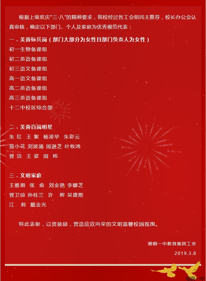 湘钢一中教育集团庆“三•八”系列评比表彰通报