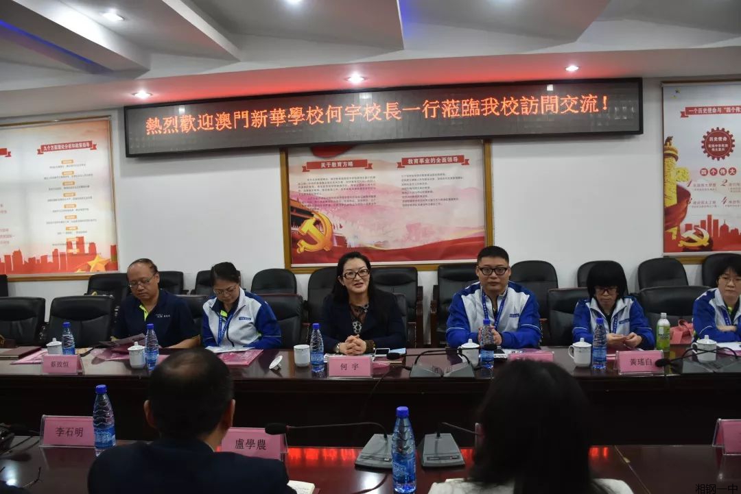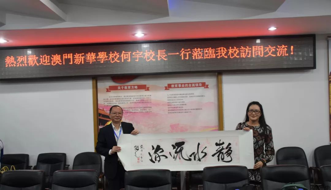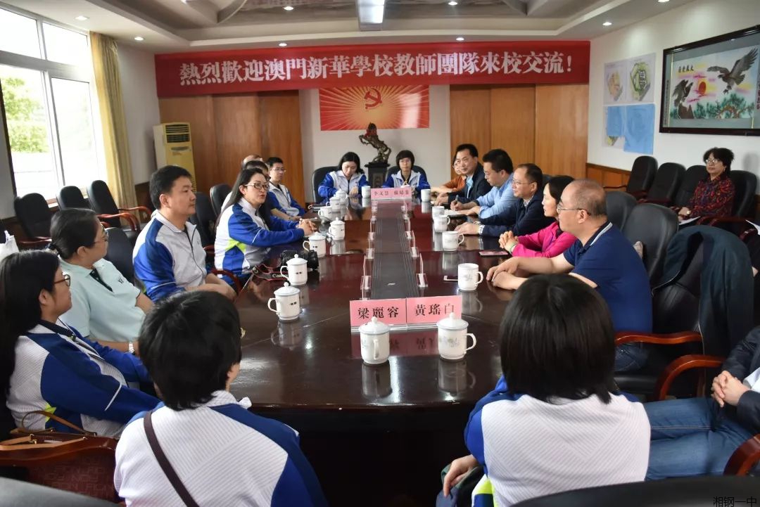 接着,何宇校长深情地述说了与我校结成姐妹学校的渊源,并介绍了新华学校的办学规模与办学理念,强调了他们注重传统文化的传播,主张中西文化合而不同,此行来到湖南湘潭倍感荣幸,并热情地邀请我校老师再赴澳门进行访问交流。之后,双方互赠礼物表情意。会议结束后,在集团教学副校长刘洁冰的主持下,新华学校老师与我校教研员及授课教师分学科进行了深入的探讨。