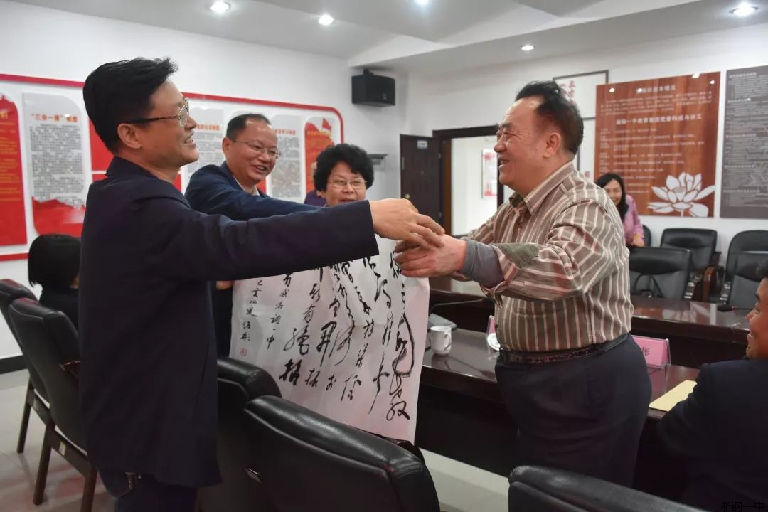 书法承文化,墨香沁校园。十二位书法艺术家大多是各行各业的资深精英,有的已是银发闪闪八十多岁高龄,但他们兴致很高,走进校园重燃青春激情,他们自由地交谈,关于书法,关于教育,意气风发,谈笑风生。大师们与我校领导互动交流,他们充分肯定了湘钢一中教育集团在教育教学上健康快速内涵发展,对于湘钢一中以“崇善向上、博学笃实”的校训为引领的大气教育表示高度赞许,对于
