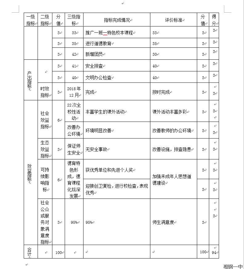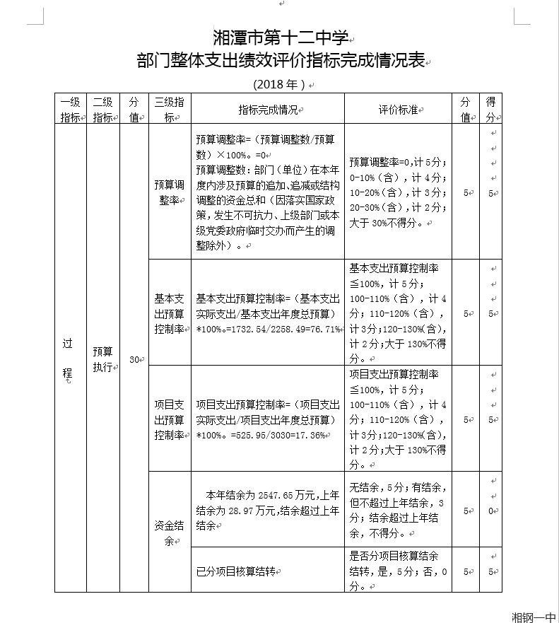 湘潭市第十二中学部门整体支出绩效评价指标完成情况表