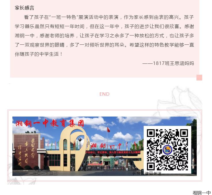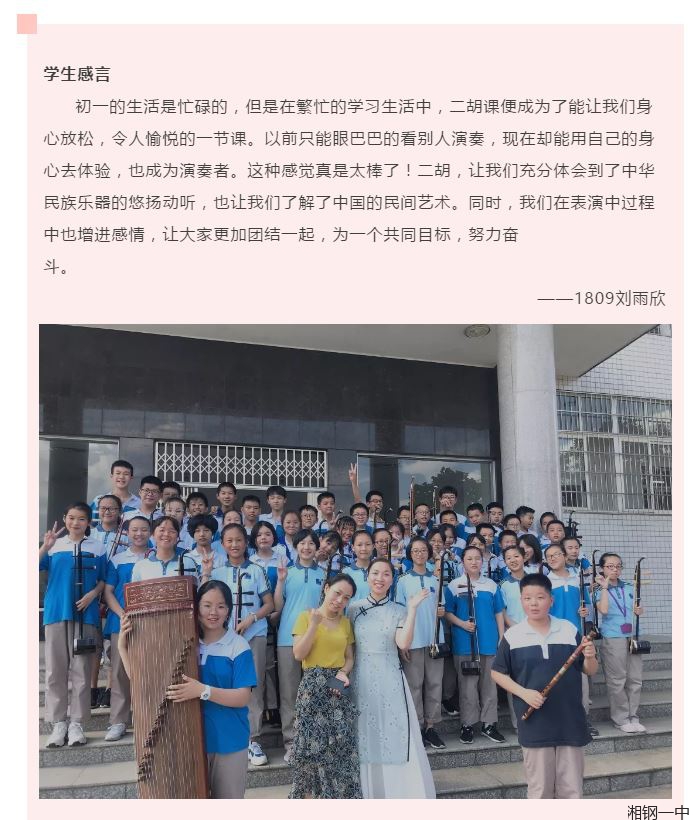 各班表演的乐曲、器乐和风格不同,但都很精彩。湘钢一中一直以来注重培养学生的文化素养,除了开设民族器乐课程,还开设了书法课、国学课等,彰显了我校建“书香校园”的办学理念。浸润在由我们先祖创造、凝练出来的传统文化精髓中,我们的文化自信正在逐步提升。