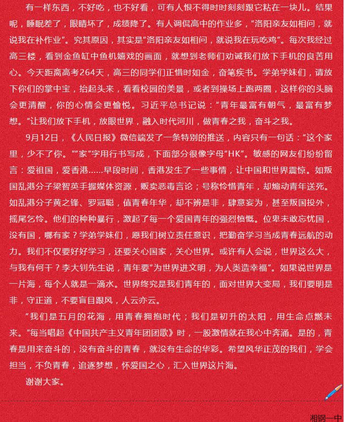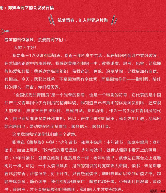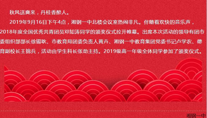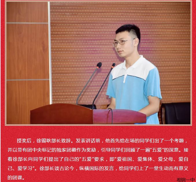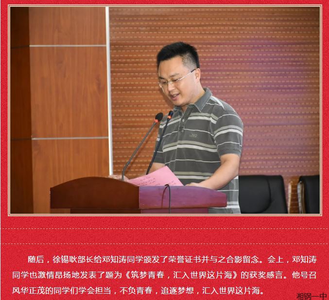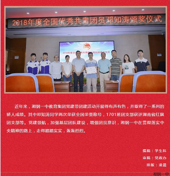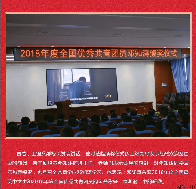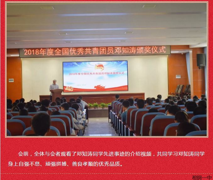 湘钢一中隆重举行2018年度全国优秀共青团员邓知涛颁奖仪式