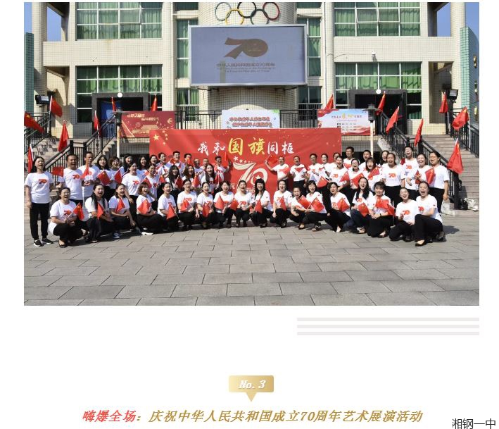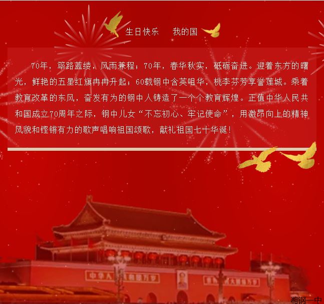 70年前,毛主席率中央机关从西柏坡向北平迁移时,他把这次进城比喻为“进京赶考”并“考出好成绩”。而今,习近平总书记提出“时代是出卷人,人民是阅卷人,我们是答卷人”。近年来,湘钢一中教育集团在上级领导的关心下,在校党委特别是王敏校长的坚强领导下,全体师生共同努力,取得了一年胜过一年的辉煌成绩,交出了一份有一份满意的答卷。如今“二次创业”旗帜正高高飘扬,如何在新时代的浪潮里,让湘钢一中的发展更上一个台阶,正考验着我们每一个钢中人。而我们强悍的钢中人,也一次次证明了自己的实力。杨树清、李其祝、刘南阳、郑达等钢中老一辈领导艰苦创业,他们是强悍的;两届熊晓鸽奖、两届钢中英才奖获奖师生,他们是强悍的;全国最美中学生、全国优秀共青团员获得者邓知涛是强悍的;莲城名师刘文方、优秀校长王军、优秀教师黄永存,他们是强悍的。他们用自己思想、业务、能力上的强悍,向伟大祖国表白、致敬!不驰于空想、不骛于虚声,踏踏实实干好工作,用学生的成长成才、学校的发展壮大、家长的满意点赞,作为献给祖国母亲七十华诞的最好礼物!