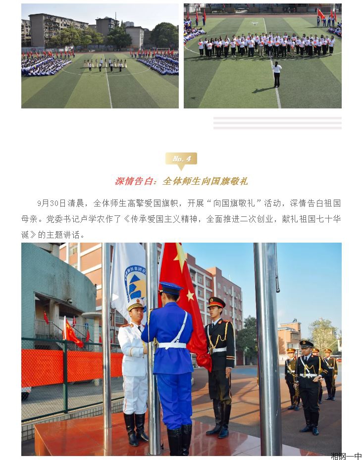 今天,我们湘钢一中本部全体师生,齐聚于此举行升旗仪式,共同庆祝中华人民共和国成立70周年。我谨代表学校党政工团恭祝祖国母亲生日快乐!也祝大家节日快乐!今天我讲话的主题是《传承爱国主义精神,全面推进二次创业,献礼祖国七十华诞》。