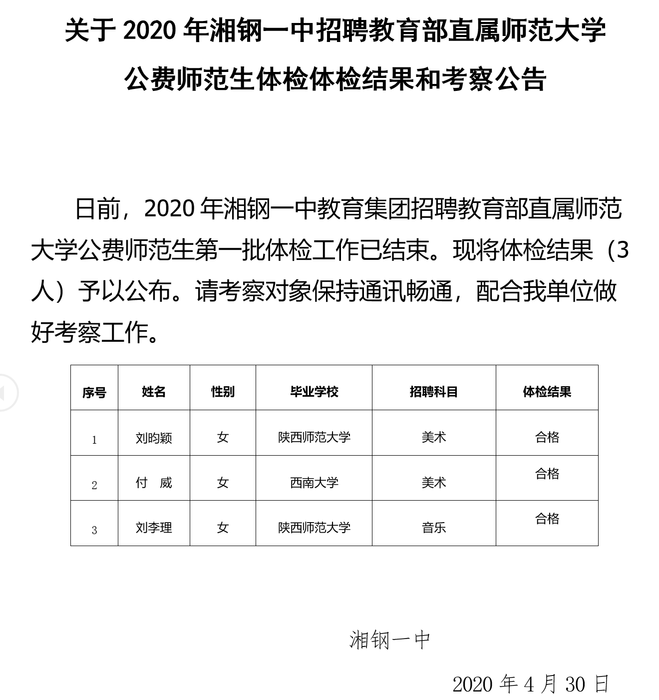 关于2020年湘钢一中招聘教育部直属师范大学 公费师范生体检体检结果和考察公告