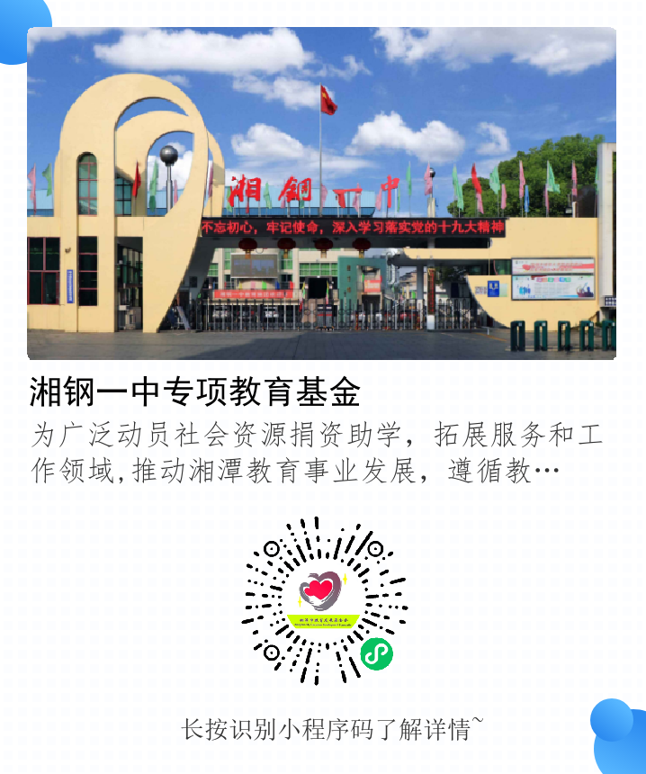 为广泛动员社会资源捐资助学发展教育,经湘钢一中行政集体研究决定,报请上级主管部门审批通过,值此湘钢一中六十周年华诞之际,特设立湘潭市教育发展基金会湘钢一中专项教育基金。专项教育基金设定项目严格遵循《湘潭市教育发展基金会章程》的规定范围,严格收支预算审批,长期开展奖教奖学、扶困助学、项目建设等促进教育事业发展和学生健康成长的教育公益事业。感谢您对湘钢一中发展建设的关爱与支持,请用微信识别下图中小程序进行捐赠操作。