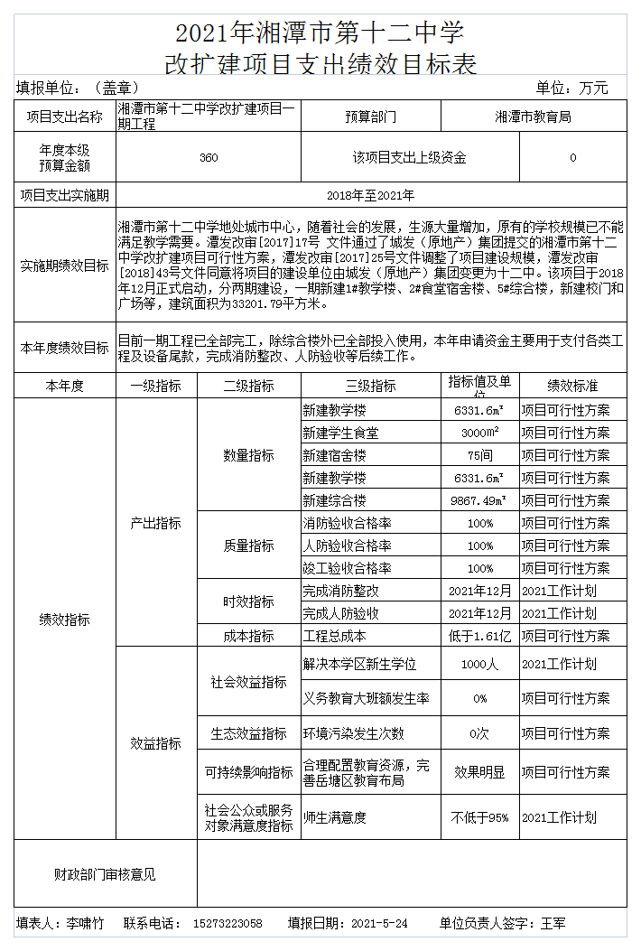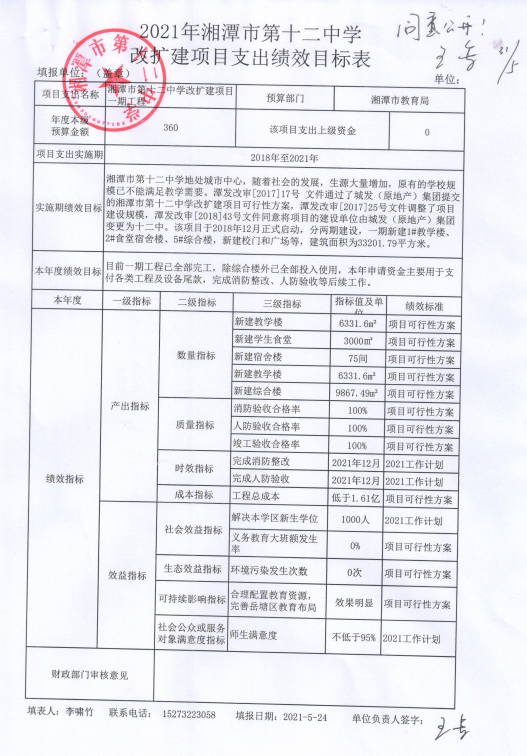 湘潭市第十二中学2021年 改扩建项目支出绩效目标表