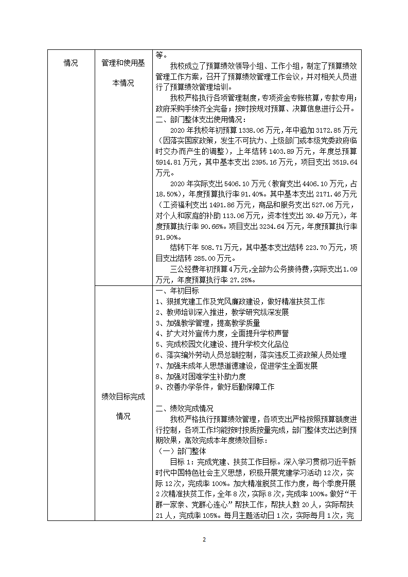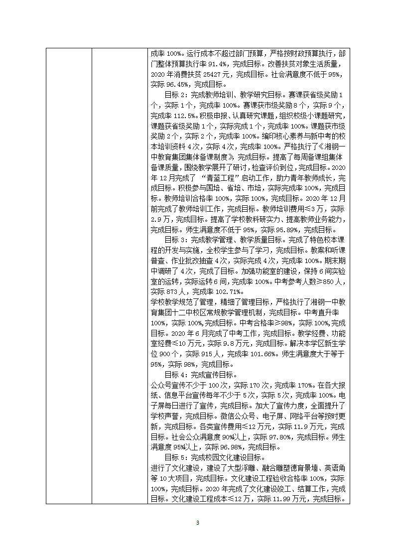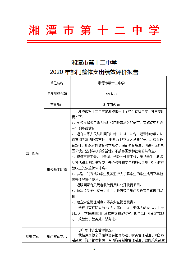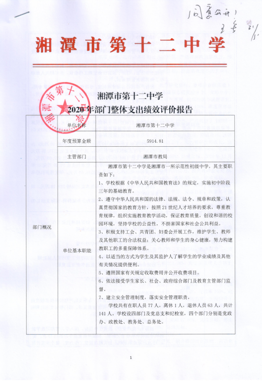 湘潭市第十二中学 2020年部门整体支出绩效评价报告