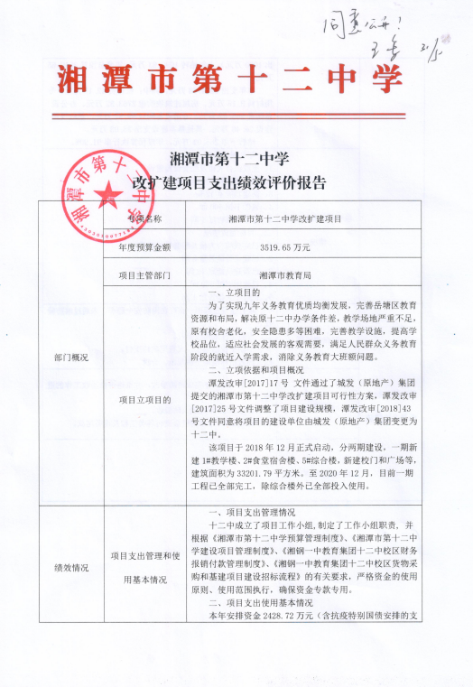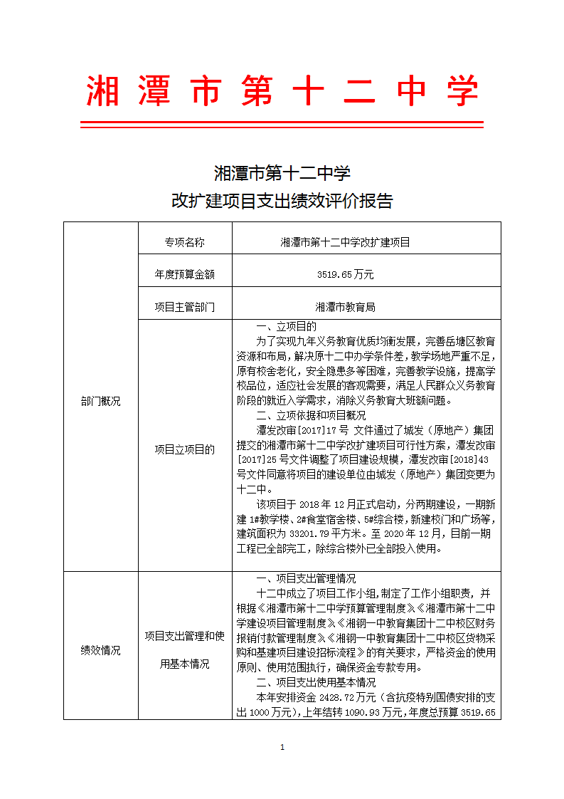 湘潭市第十二中学 改扩建项目支出绩效评价报告