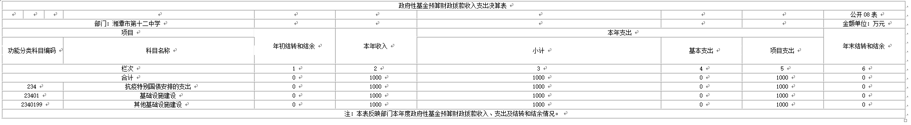 2020年度政府性基金预算财政拨款收入1000万元;年初结转和结余0万元;支出1000万元,其中基本支出0万元,项目支出1000万元;年末结转和结余0万元。