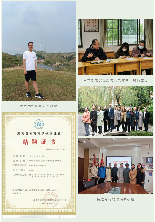 青年教师刚刚走上岗位,难免会存在物质上的清贫、工作上的艰辛、精神上的迷茫。可见,对青年教师成长的关注需要从单一走向综合,需要从关注专业成长向全人成长转变,积极关心、了解青年教师的发展状况和生活需求。党委卢学农书记高度关注思政教师的成长,一再强调思政教师要扛起落实立德树人的根本任务。政治教研组始终坚持发展难题互助,生活困难共帮,以家人的心态在教研组内相处,滋润着成长的心灵。