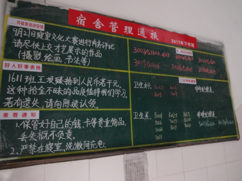 9月份开学以来,安全科、学生科按照工作计划精心组织督促,年级组和班主任密切配合,宿舍管理以第十九届寝室文化大赛为引领,寝室卫生内务整理评比持续开展,学生文明礼貌和习惯养成教育成效显著,营造了舒适温馨的寝室环境。随后,由安全科、学生科、年级组和宿管部组成的专项检查评比,特对下列班级(寝室)予以表彰,希望获奖班级(寝室)戒骄戒躁,在今后的寝室管理中再创新佳绩。