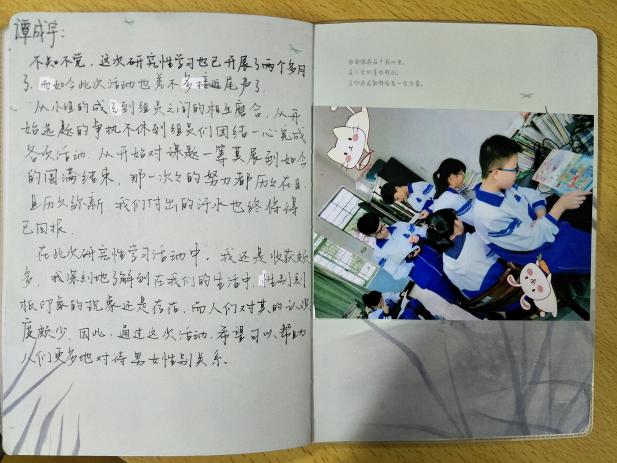 在答辩陈述的过程中,学生们就这一次参与的研究性学习经历谈到了自己的看法。他们认为锻炼了自己的能力,深入了解了性别刻板的印象,也引起了他们对生活中一些看似平常问题的思考,更重要的是体会到团队合作的重要性,但帮助更多人消除性别刻板印象的必要性和迫切性,仍然是他们要面对和今后要继续研究的课题。小组的结题答辩会,邀请到了他们的指导老师冯伟新,以及湘钢一中教科室主管学生研究性学习课题研究的凌齐鸣教研员和胡芳老师。