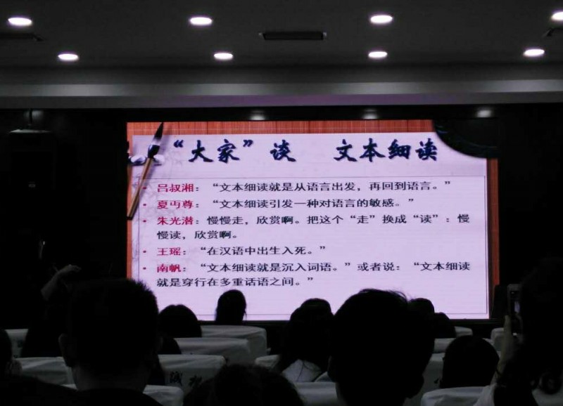 随后,周敏教授以“文本细读,让语文更美丽”为题开展了精彩讲座。讲座从《记承天寺夜游》的文本细读开始,阐释了文本细读对于语文教学的重要性,指出语文教师应该沉入言语,慢慢欣赏,深入地读,再浅近地教,才能引导学生发现语文的美丽,引发他们对于语言的敏感。对于如何进行文本细读,周教授的指导可谓是既有理论高度,又相当接地气。她旁征博引,指导老师们如何从微观、中观、宏观角度来发现文本的秘妙,如何以文本、作者、读者为中心来寻觅文本中的细读点。从李商隐诗歌里“时间”的秘妙到咏秋诗词中的“秋思”主题的秘妙……两百余位听课者专注安静地倾听,时而若有所思地点头,时而埋头奋笔疾书,时而对精妙的观点拍照记录。