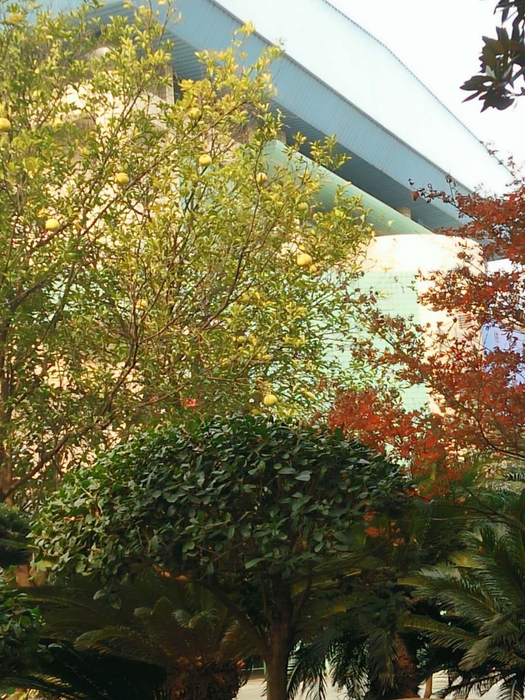 各样的树木散乱的摆在土里:银杏、芭蕉,数得上名的,数不上名的。或高或矮的乔木都展开了枝叶,一层一层地舒展开来,严严实实几乎盖住了整片天空。树儿们掩过那片清冷的天空,给这冬季的寒日裹上了一层生机,披上了一丝暖意。