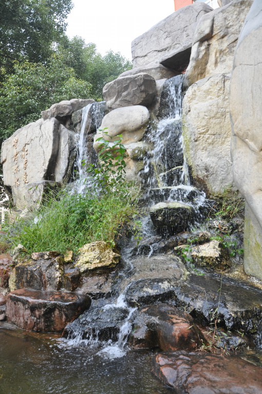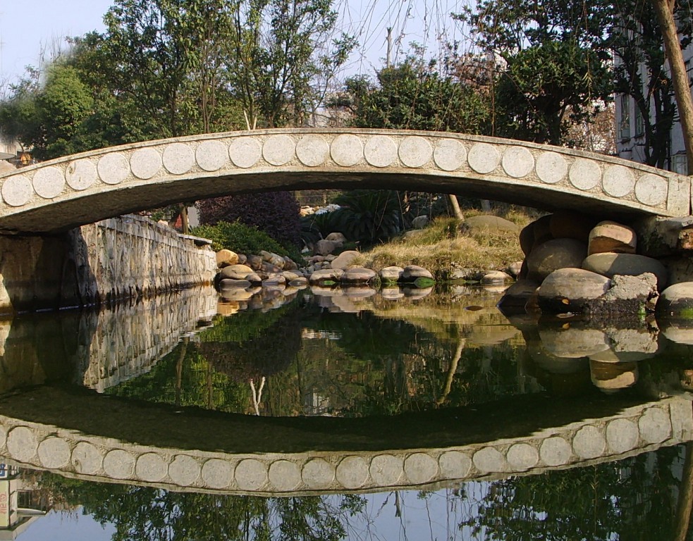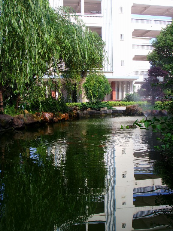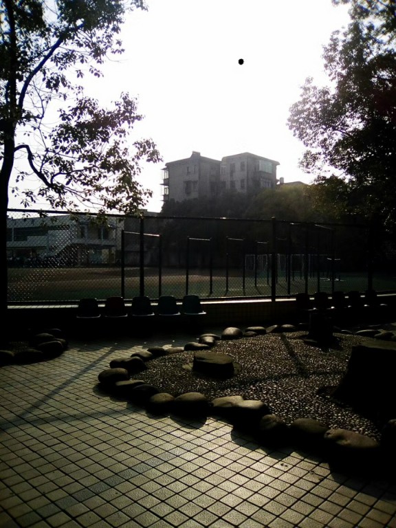 轻轻拍下石椅上的灰尘,坐下来慢慢欣赏。只见小池里浮着几片落叶,摇摇晃晃如几只小舟一般;池底遍是淤泥,仔细望去,才偶尔能辨出几根枯枝,几片败叶。池子深处被几层稀疏的枝叶包着,侧身望去,才 能见到几块湿滑的石头,有些石块略显平整,连接南北两泮,可以看出是左侧“过桥石”的前身。池侧有一个巨大的花盆,一尊苏铁静立在盆上,盆侧刻着两行诗——“華夏有天。