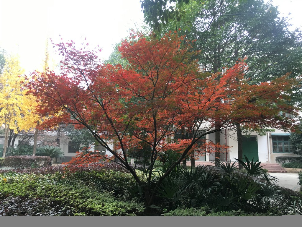 大家的注意力都在那几棵排列整齐的满树金黄的银杏上,吸引了我的却是银杏附近一个小花坛中的一株小树。它是视野里唯一的红。