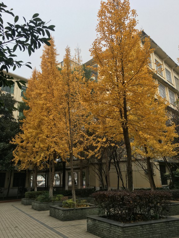 这里的冬天就是这样,即使万物冻得瑟瑟发抖,银杏和枫叶还是该黄便黄得烂漫,红便红得耀眼。所以,即使再冷,看见校园后方那一排银杏及一株小小的枫树,你便能像遇着了暖阳一般欣喜、精神抖擞。