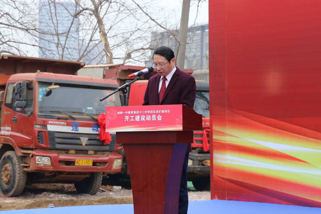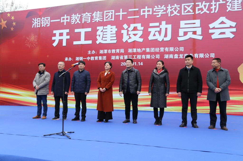 2018年1月14日上午9点8分,湘钢一中教育集团十二中校区改扩建项目开工典礼隆重举行。开工典礼由湘潭市人民政府副秘书长刘定良主持,湘潭市人民政府副市长刘永珍宣布项目开工,湘潭市人大教科文卫委主任委员陈志高、湘潭市政协文卫法制群团委主任谢咸禹、湘潭市教育局党委副书记副局长谢兰焰、湘潭地产集团党委书记陈卫文、岳塘区人民政府副区长刘亚军、湖南省第三工程有限公司总经理袁志辉、湘钢一中教育集团校长王敏以及施工方代表、业主代表等出席了典礼。