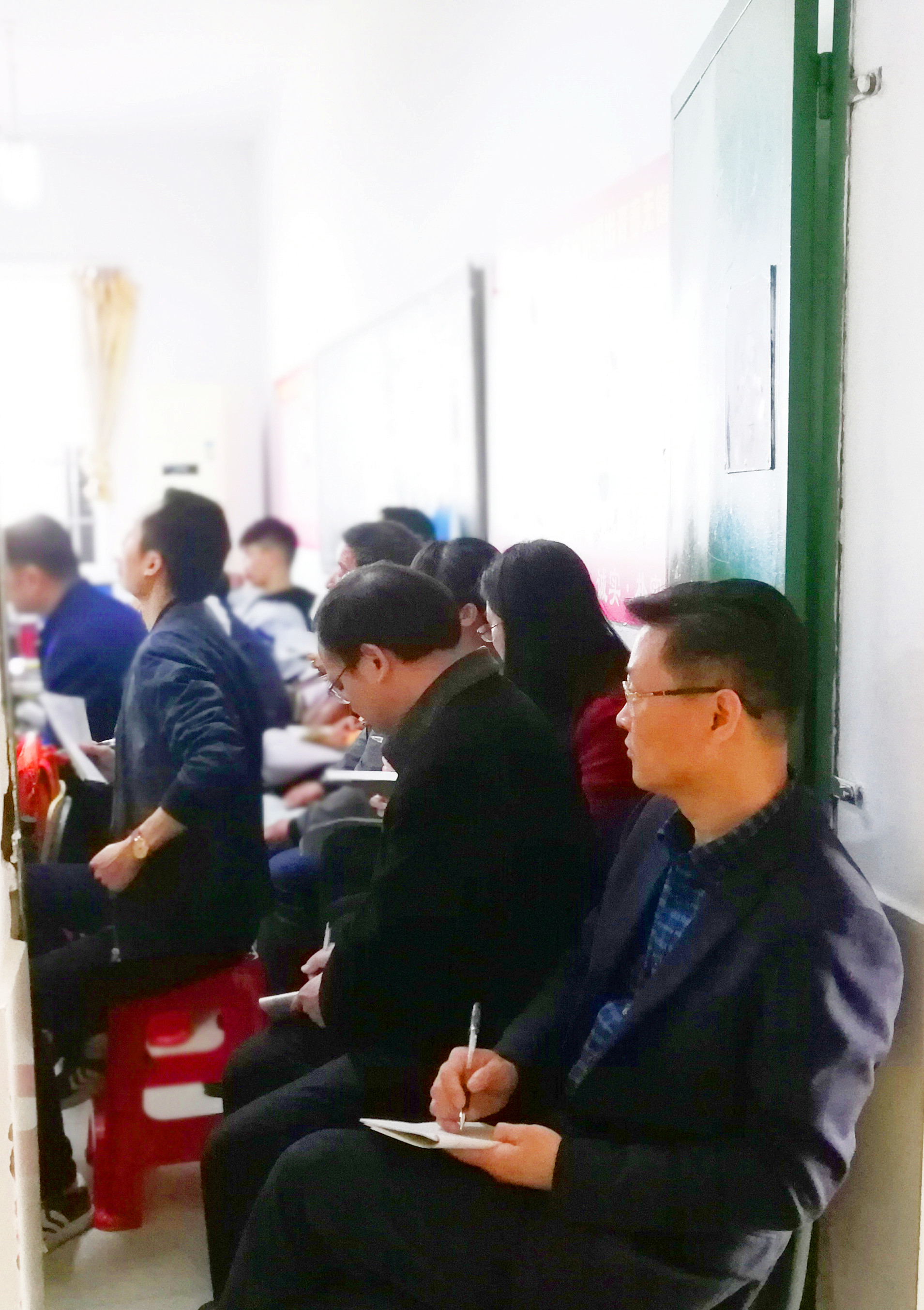第二节课,市教科院各学科教研员在我校教研员、各学科组老师的陪同下,分组听课。承担此次公开课任务的除了资深骨干教师李玉华,还有彭利斌、赵金辉、邹柱、石敏、李琼等年轻的后起之秀。承担公开课任务的老师们,无不经过精心的备课、细致的打磨,以及组内多次的试讲和研讨,因此,才得以给听课的老师们呈上一堂“饕餮大餐”。听课的老师们无不聚精会神,受益匪浅。