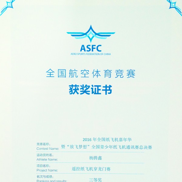 近日,从国家体育总局获悉,湘钢一中学子杨腾鑫在浙江杭州举办的2016全国纸飞机嘉年华暨“放飞梦想”全国青少年纸飞机通讯赛总决赛·遥控纸飞机穿龙门赛中喜获国家级大奖。