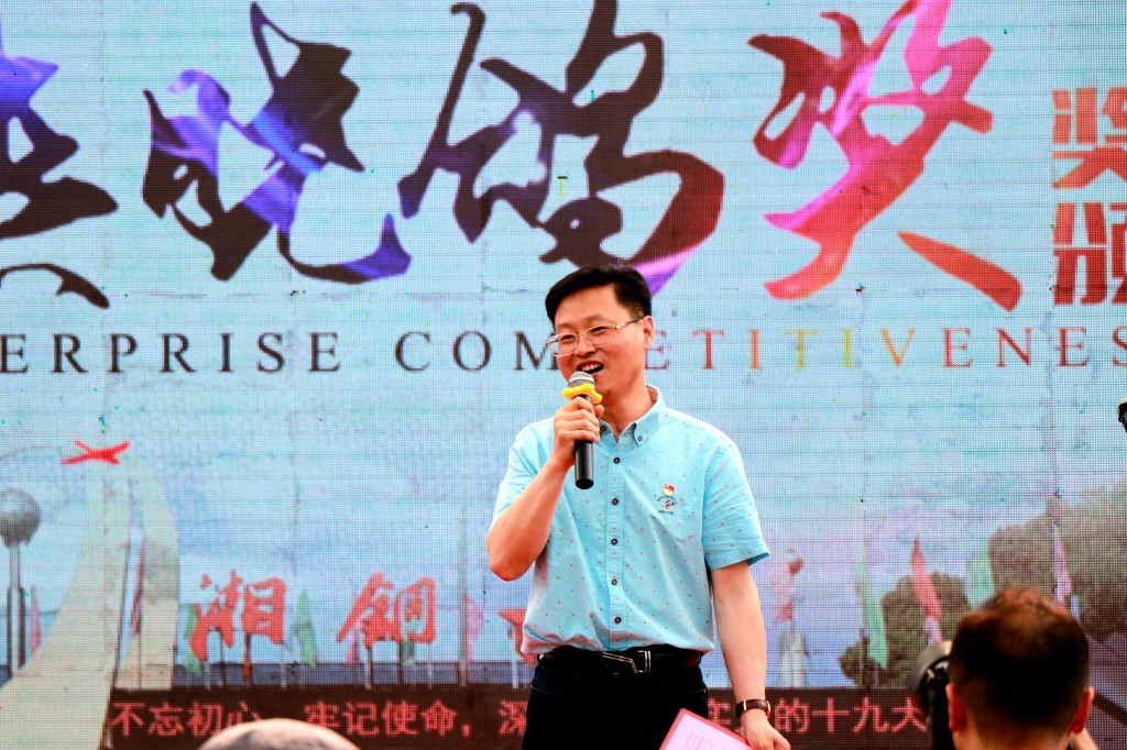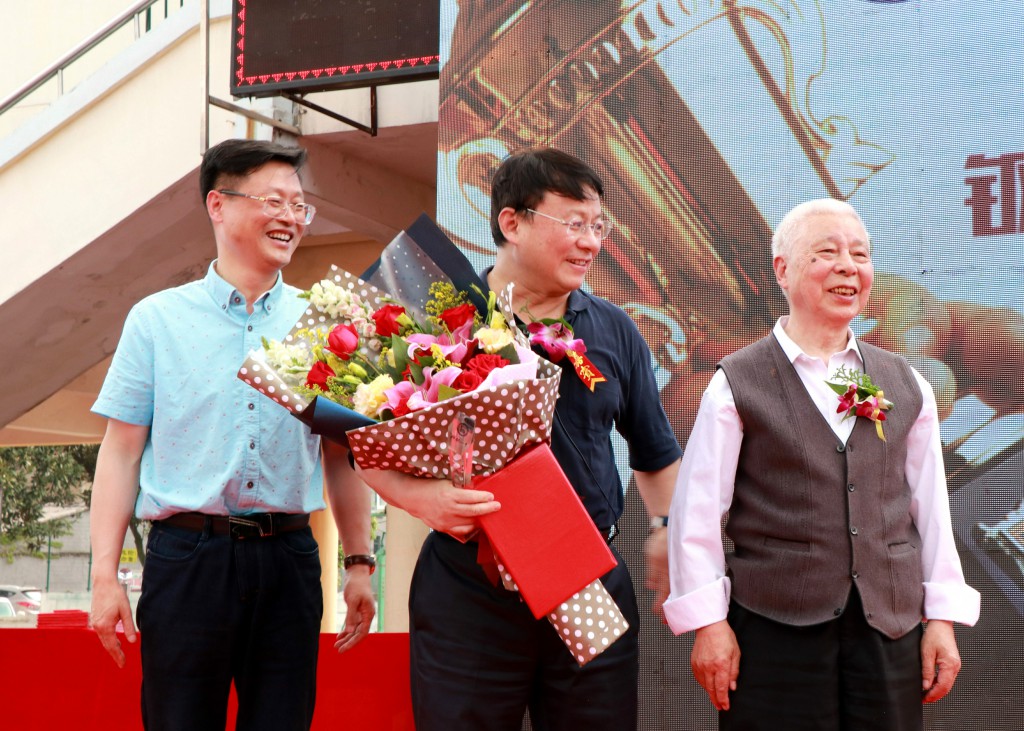 在颁奖典礼上,湘钢一中教育集团校长王敏邀请周国良老师一同为熊晓鸽先生赠送“钢中杰出校友”杯与证书。