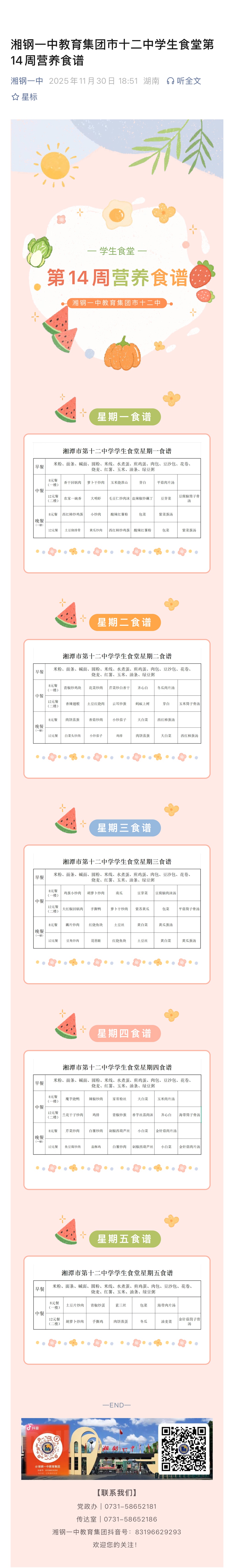 湘钢一中教育集团市十二中学生食堂第14周营养食谱