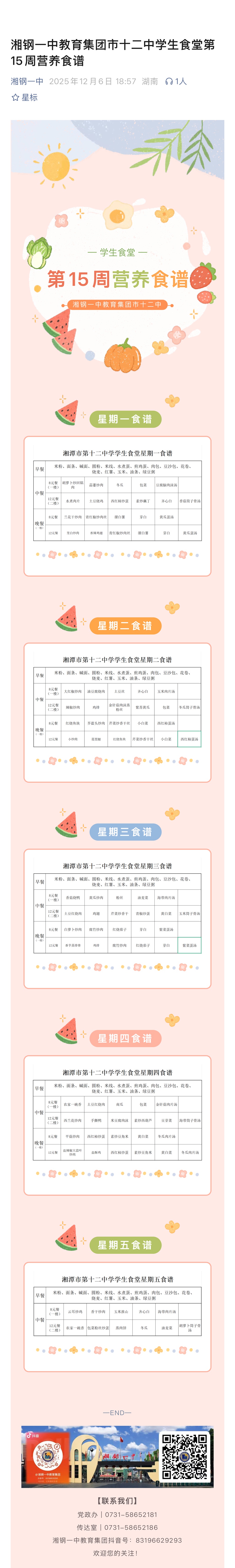 湘钢一中教育集团市十二中学生食堂第15周营养食谱