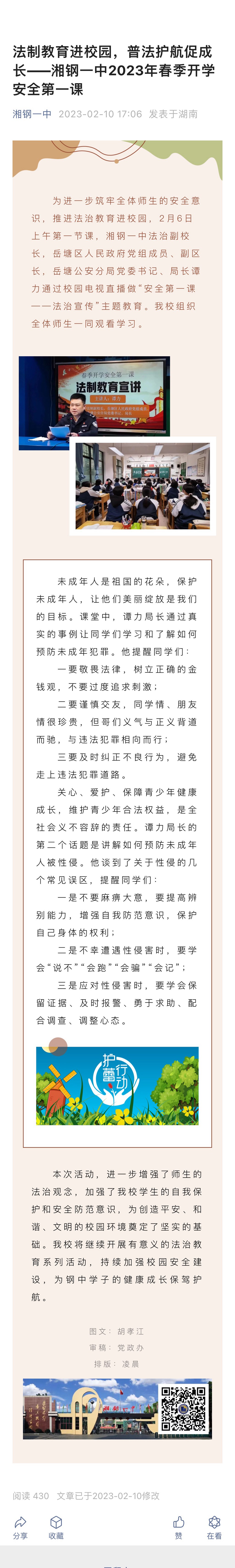 法制教育进校园,普法护航促成长——湘钢一中2023年春季开学安全第一课