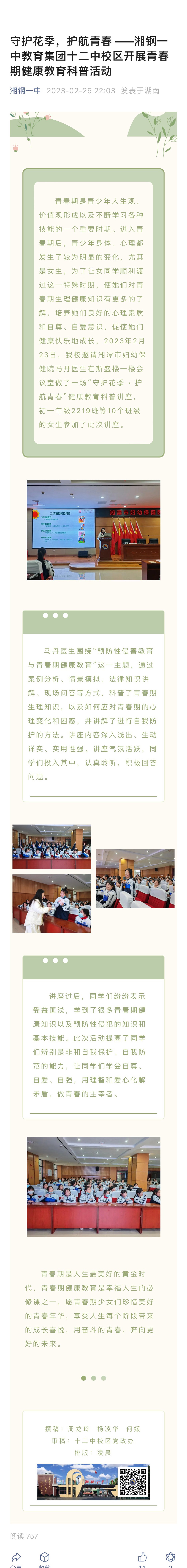 守护花季,护航青春 ——湘钢一中教育集团十二中校区开展青春期健康教育科普活动