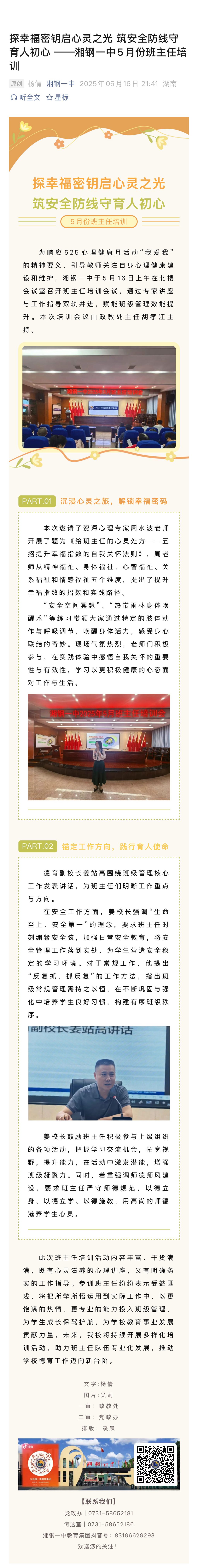 探幸福密钥启心灵之光 筑安全防线守育人初心 ——湘钢一中5月份班主任培训