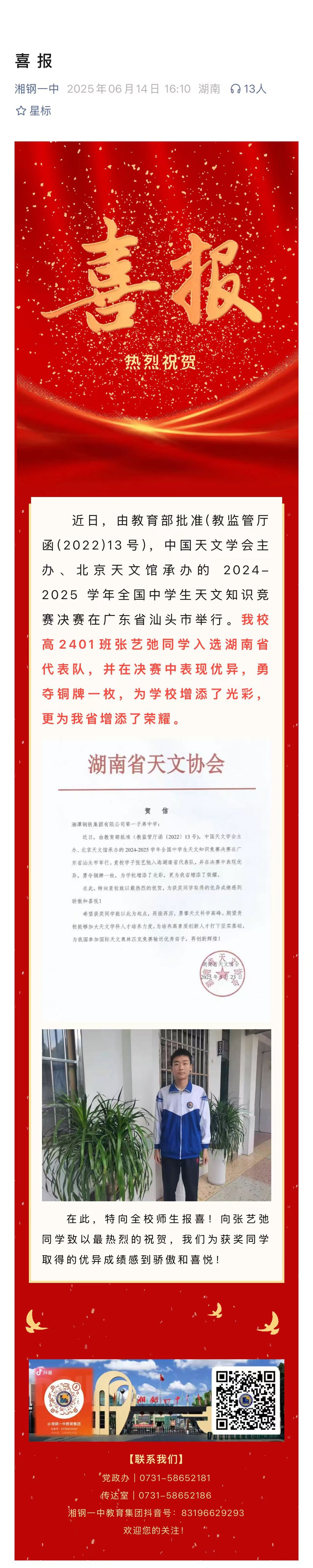 喜报:由教育部批准(教监管厅函(2022)13号),中国天文学会主办、北京天文馆承办的 2024-2025 学年全国中学生天文知识竞赛决赛在广东省汕头市举行。我校高2401班张艺弛同学入选湖南省代表队,并在决赛中表现优异,勇夺铜牌一枚,为学校增添了光彩,更为我省增添了荣耀。