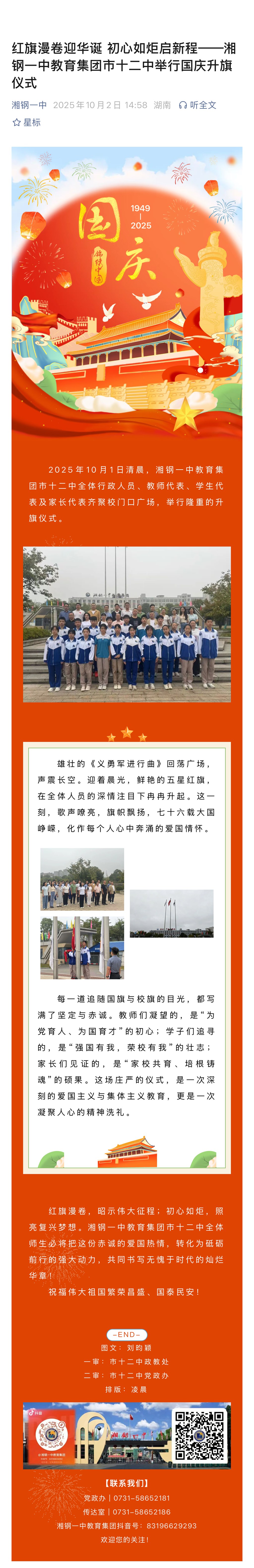 红旗漫卷迎华诞 初心如炬启新程——湘钢一中教育集团市十二中举行国庆升旗仪式