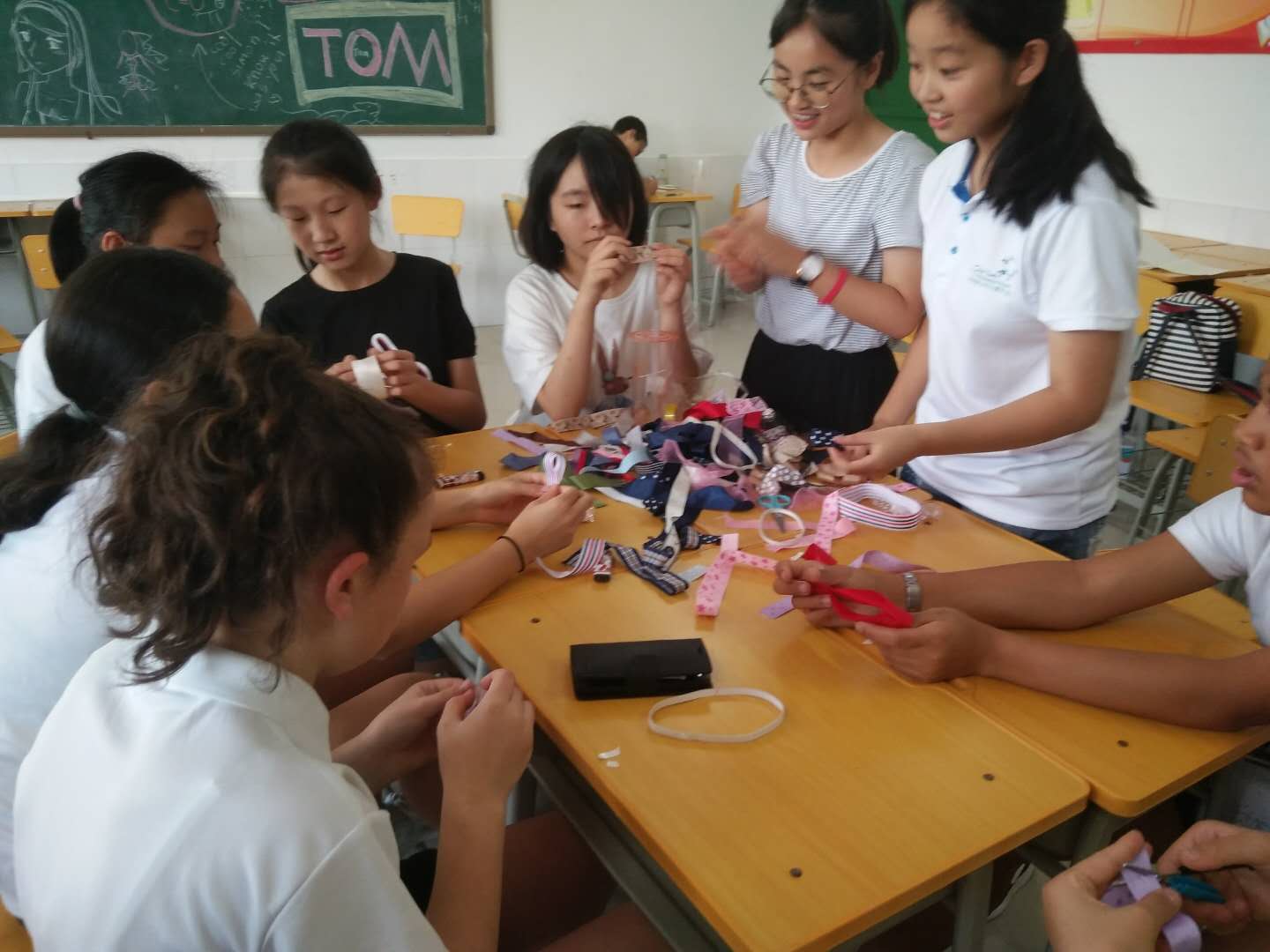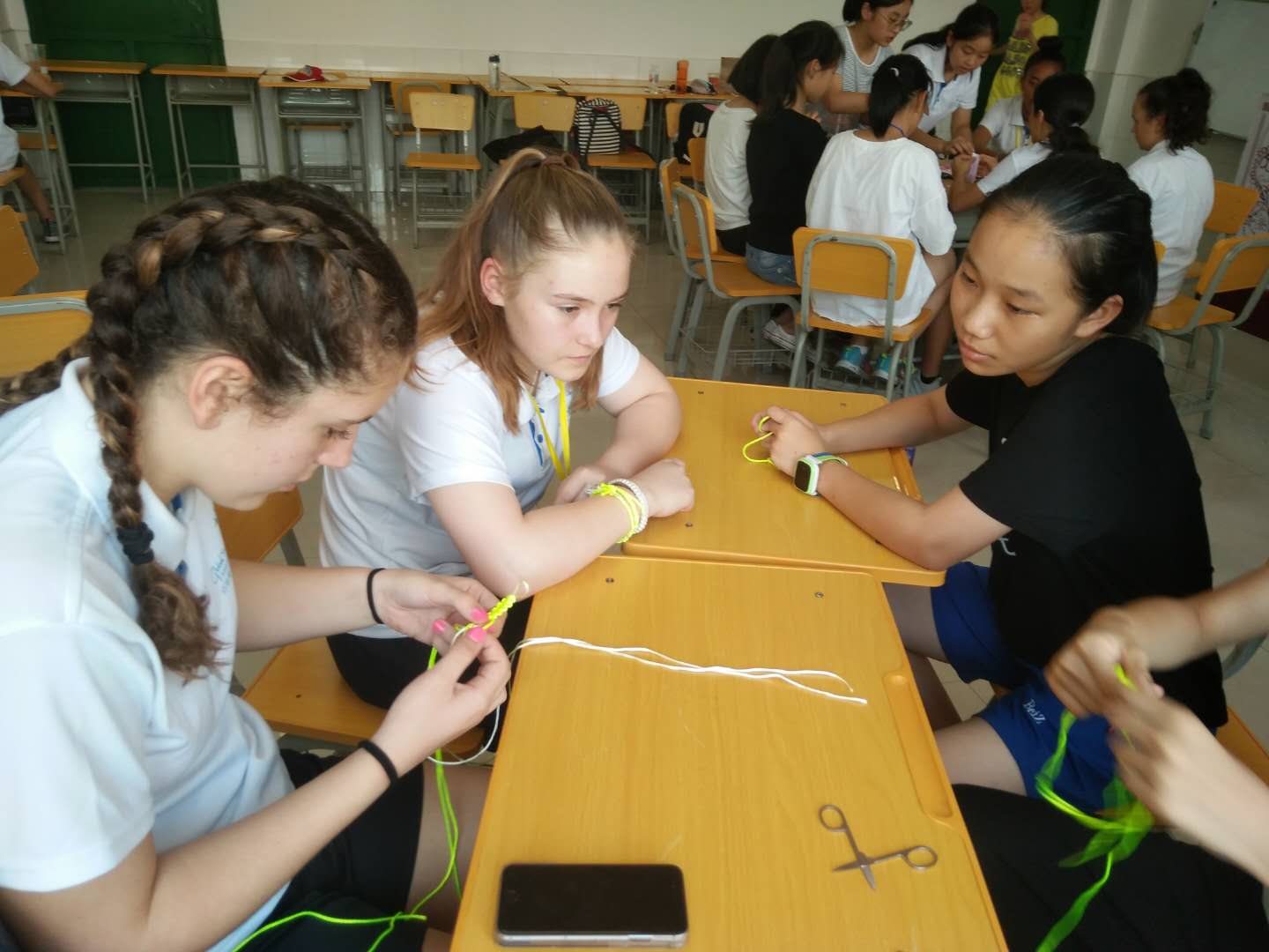 中国的同学们用流利的英语教会了外国同学们手工制作手链和发夹。