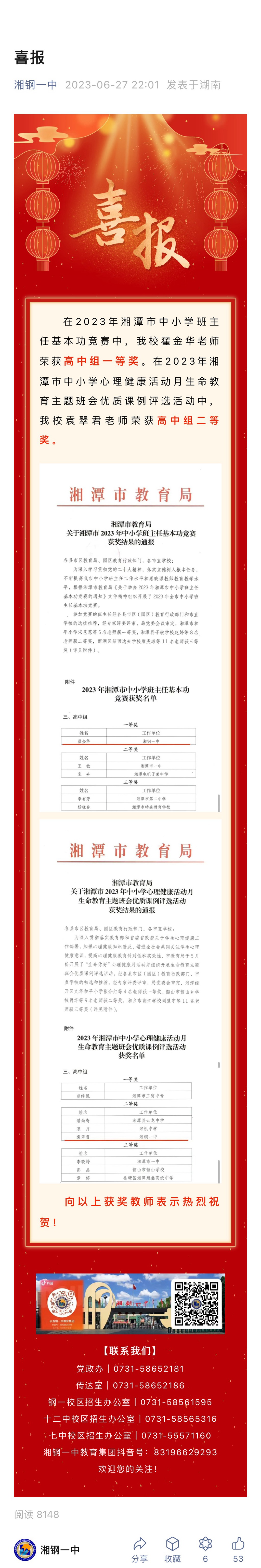 喜报:在2023年湘潭市中小学班主任基本功竞赛中,我校翟金华老师荣获高中组一等奖。在2023年湘潭市中小学心理健康活动月生命教育主题班会优质课例评选活动中,我校袁翠君老师荣获高中组二等奖